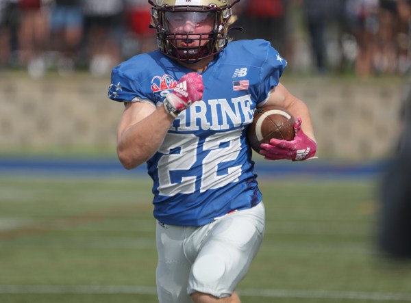 My moment, in that regard in this game, was when the West’s Hayden Whitney (Thornton Academy) came clear around the left end in the first half.  My concern was tacklers coming from the left who would drive him out-of-bounds to where I was.  I jumped out of picture-taking possibility early and Hayden was driven out of bounds about five yards before he reached me. I got a shot of Hayden (41-yard carry) but his eyes are closed.