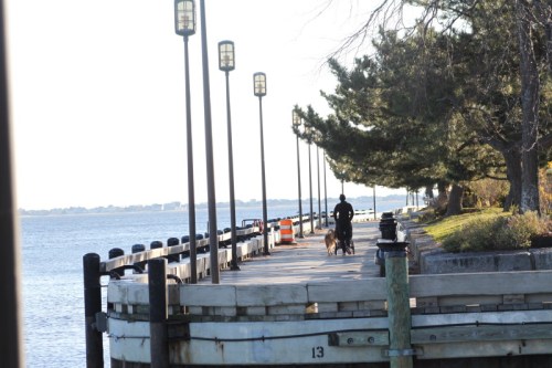This was a morning shot along the Merrimac River in Newburyport. It has a lady with a child in a stroller and a dog alongside.
