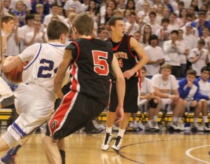 Richard Bronson (#15) gets some tighter second half defense from Zack Lewis (#3).
