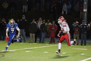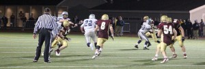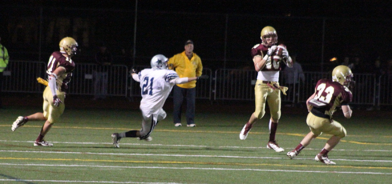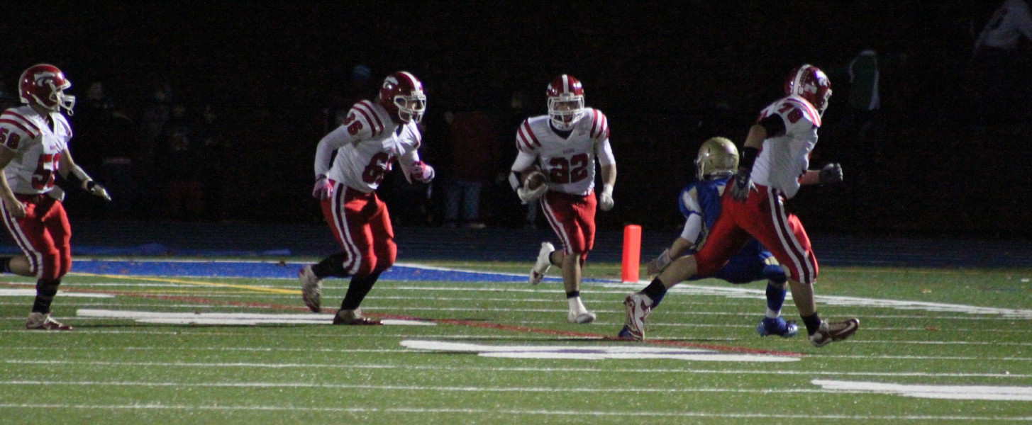 (2) After trying to get Elliott Burr in on the left (twice), the Generals set up as if they would try it a third time. However, instead, Trevor Lyons rolled right, beat the corner (Evan Habib), and jumped into a defender (Jared Bradbury) at the goal line to score with 32 seconds left. Ironically, Trevor hit that same right corner of the end zone in HW’s 18-6 win at Newburyport on September 23rd.