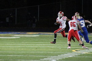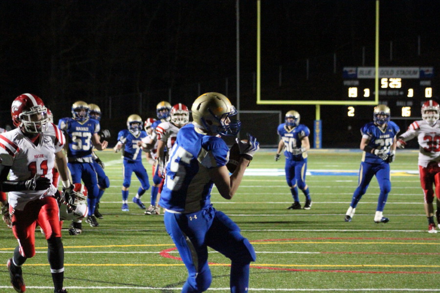 Elliott Burr (22) breaks free with a screen pass for 29 yards setting up the HW touchdown late in the game.