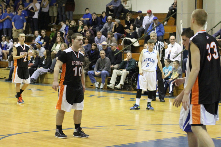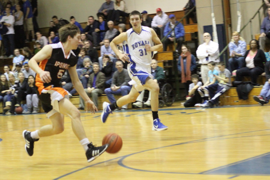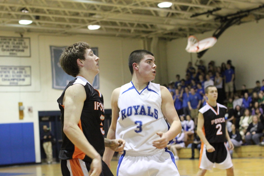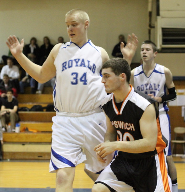 Ipswich went up by six a couple of times after that (48-42 & 50-44) before three straight Tyler Wade assisted baskets knotted the score at 50-50 with ninety seconds left. During the Royal comeback, 6-6 Pat Bjork twice rushed back to intimidate Ipswich shooters (Dan O’Flynn and Matt Jaeger) on breakaways.