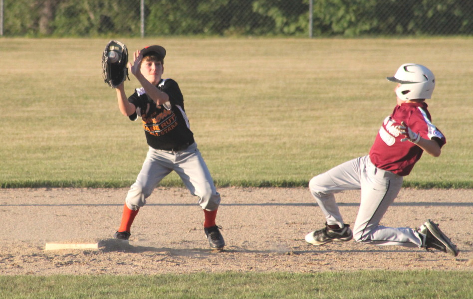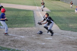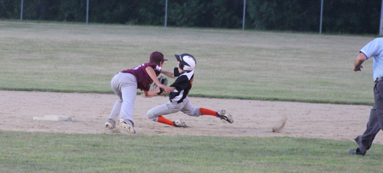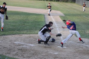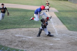 The most acrobatic sequence in this game was Taylor Heath jumping in an attempt to avoid the tag of catcher Will Stinson.  Taylor was ruled out.