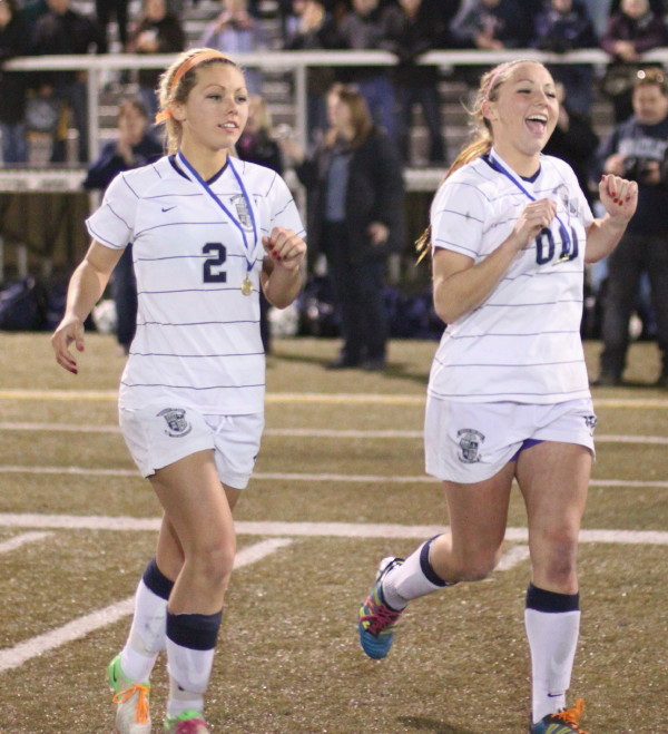 Immaculate captains Lindsay Jossick (3 goals) and Sierra Stein (1 goal) head out for championship award.
