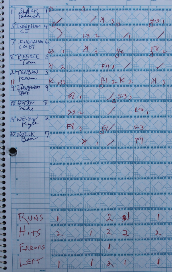 Patrick Slack (1-0) put himself into some serious trouble in the sixth but managed to escape with minimal damage. Four batters into the sixth inning Patrick had given up a single (Ryan Law), made a bad throw to second on a grounder (Josh Guertin), walked a batter (Henry Sacco), and hit another batter (Kyle Barber).