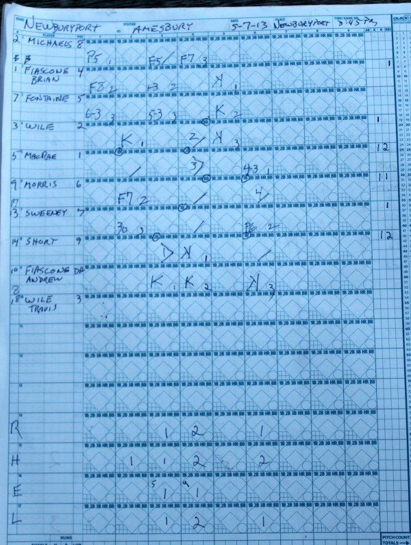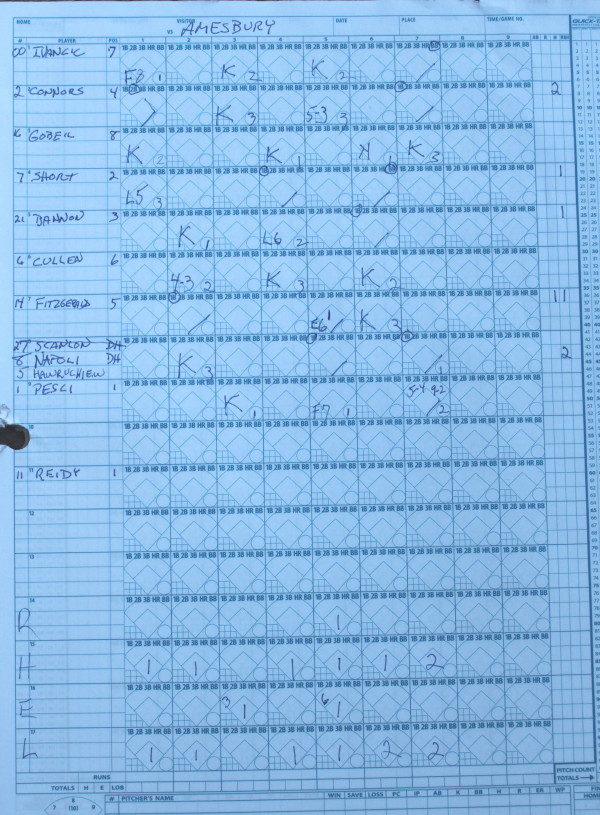 Amesbury’s questionable base-running happened in the last inning. The Indians had two runners (John Pesci and Adam Ivancic) on with one out down three runs. Tommy Connors singled sharply up the middle to centerfielder Ian Michaels. John Pesci tried to score but Ian Michaels’ throw home was there in plenty of time to record the second out of the inning. So instead of bases loaded with one out, the Indians had two on and two out. Connor MacRae then K’d Devlin Gobeil to end the game.