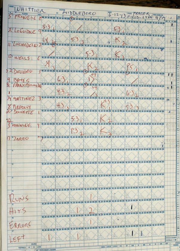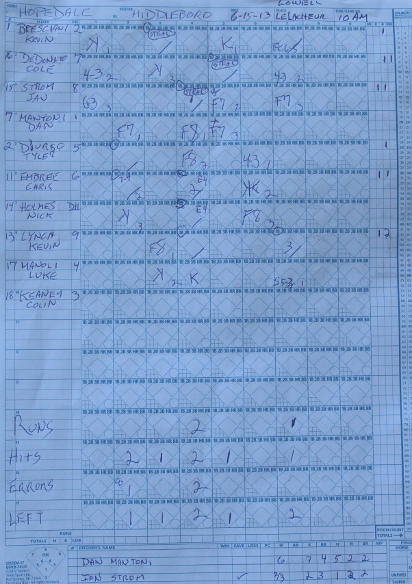 Dan Mantoni had limited the Sachems to three hits over five innings but in the sixth inning Middleboro got a 2-out/2 strike triple from Andrew Card to right bringing Kevin Huscher across from third tying this game at, 2-2.