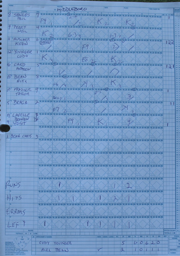 (3) Sophomore Kevin Bresciani reached third with two outs but Middleboro starter Cody Younger K’d Cole DeDonato looking to end inning.