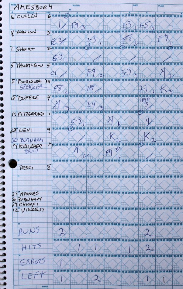 Amesbury came back in the bottom of the first to load the bases with one out. Spencer Fournier’s fly ball scored Ben Cullen from third. On that play the NHS throw from the outfield came home but the throw (catcher Scott Webster) back to second was wild and the two runners ended up in scoring position. A passed ball (Scott Webster) allowed Pat Scanlon to cross with Amesbury’s second run.