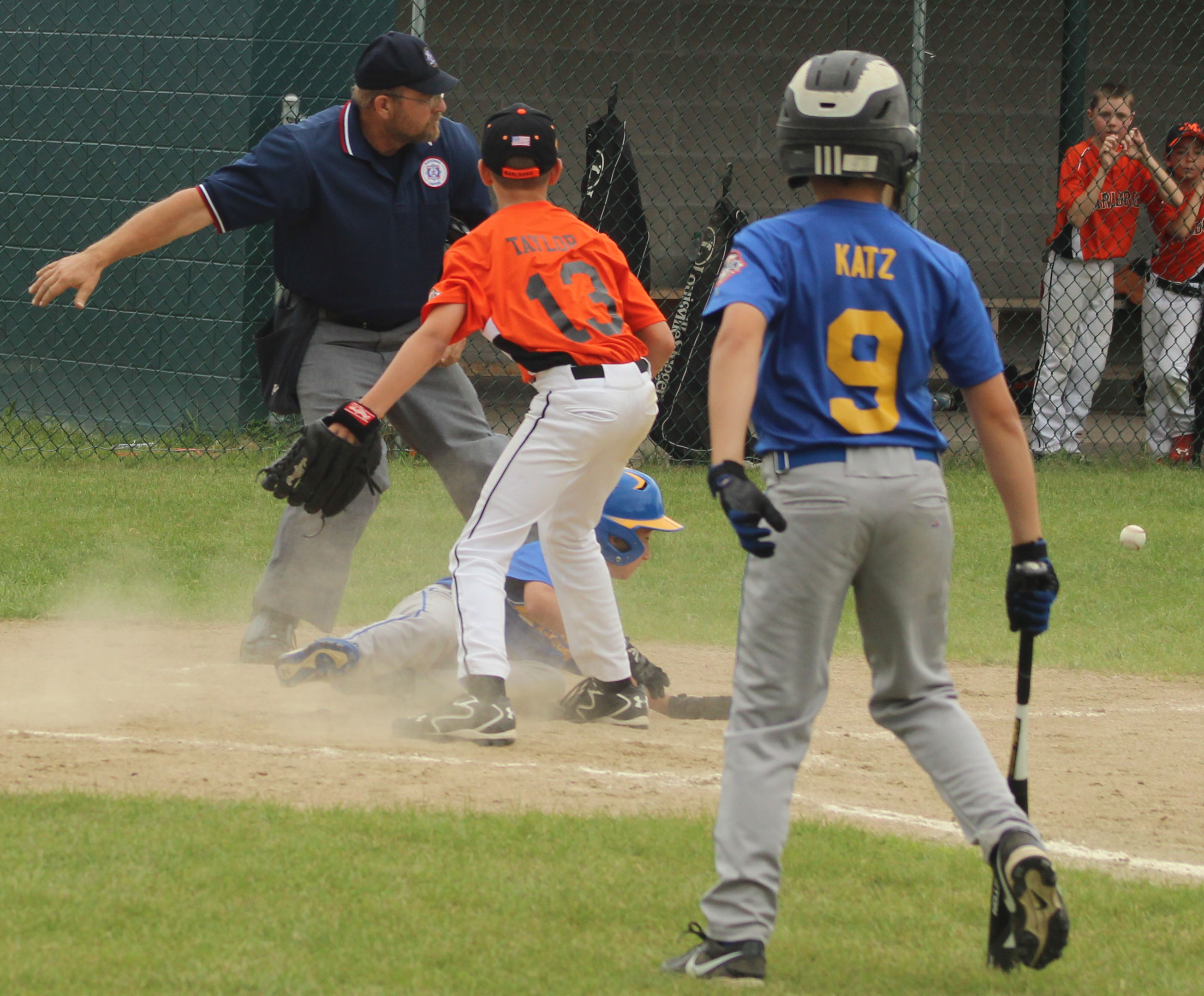 Jake Miceli slides while Ryan Taylor awaits throw