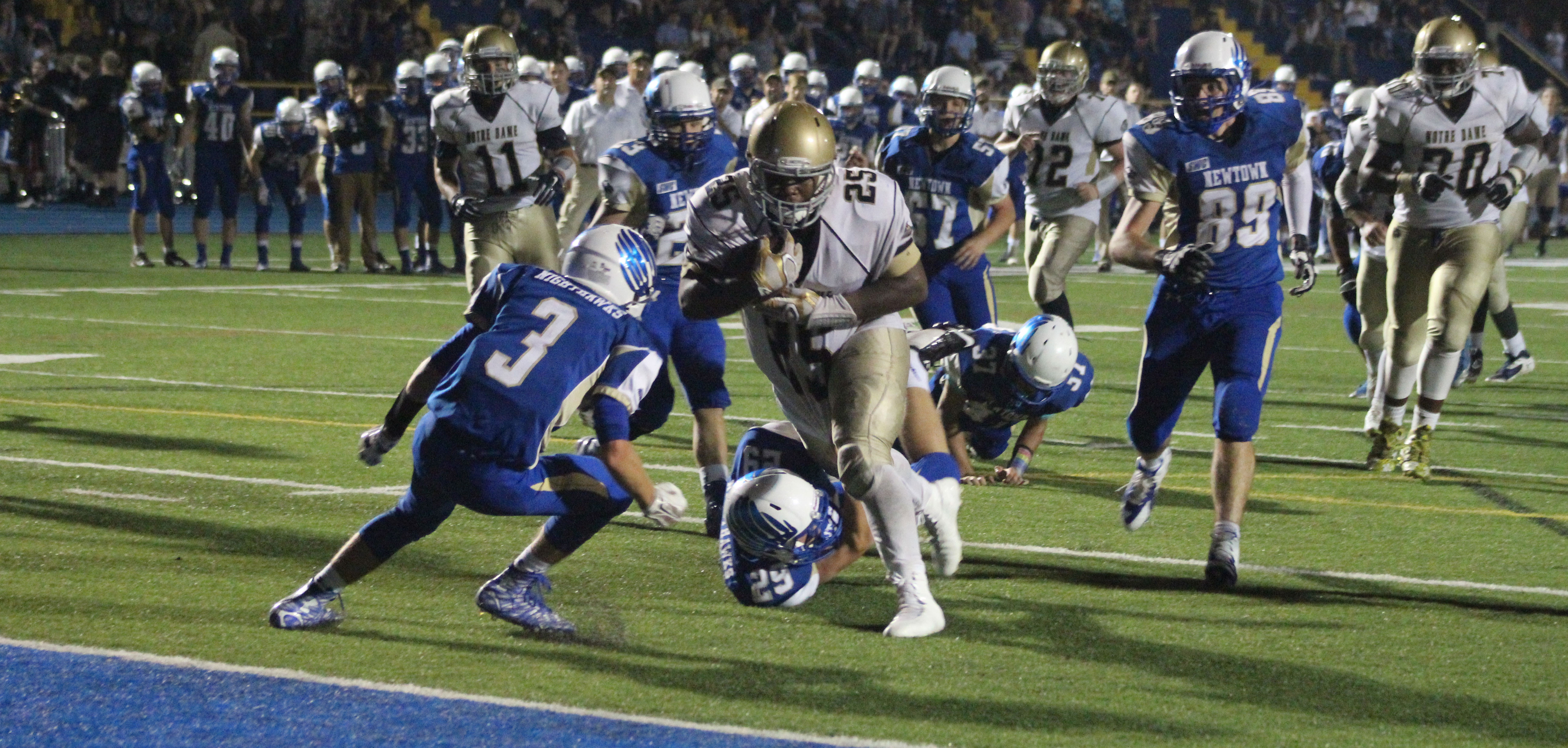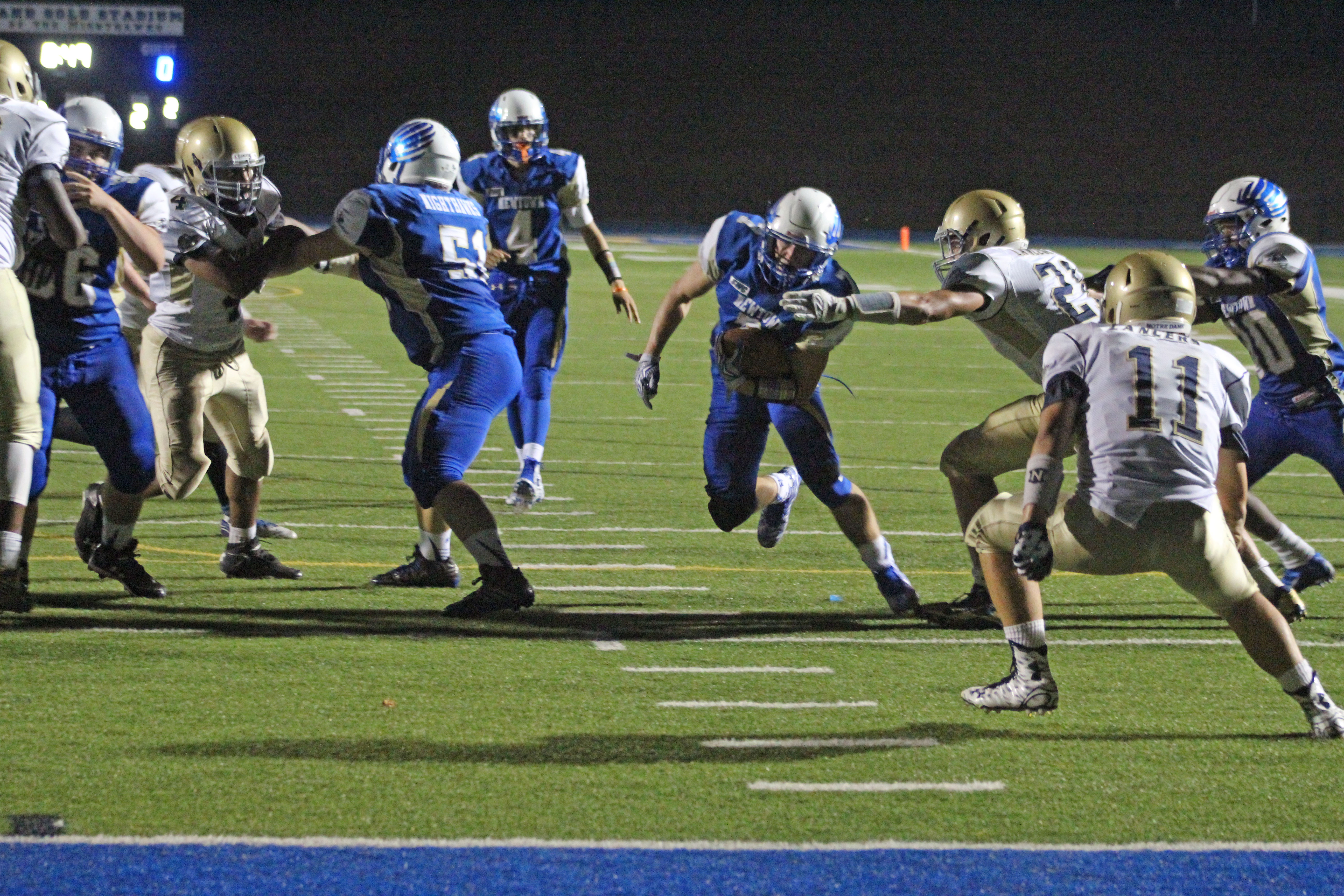 The Newtown defense was clearly tuned into the presence of senior Hakim Fleming. Hakim tallied twelve touchdowns in 2014 including 1251 yards gained. The Hawks starting defense kept the 5’11” (255 pounds) back from even getting into their secondary. Therefore, sustaining a drive wasn’t going to happen for ND.
