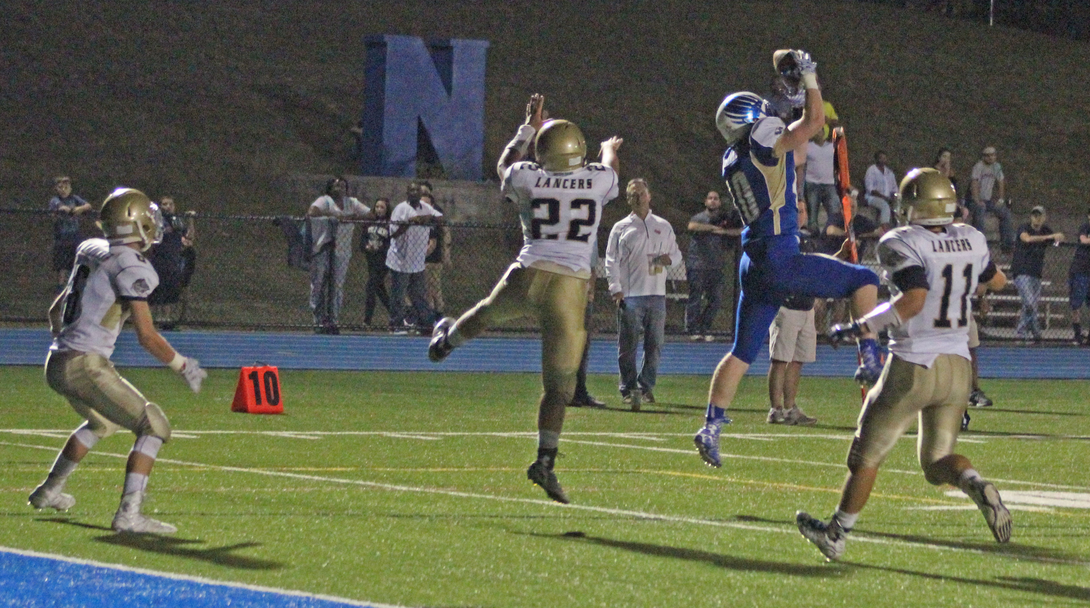 At 7:43 Ben Mason took a short pass from QB Justin Dunn into the end zone. Ben’s TD started an evening in which Hawks’ runners got into the Lancers’ secondary in the first half with regularity. Tackling Newtown’s big/fast/elusive ball-carriers was a first-half nightmare for ND.