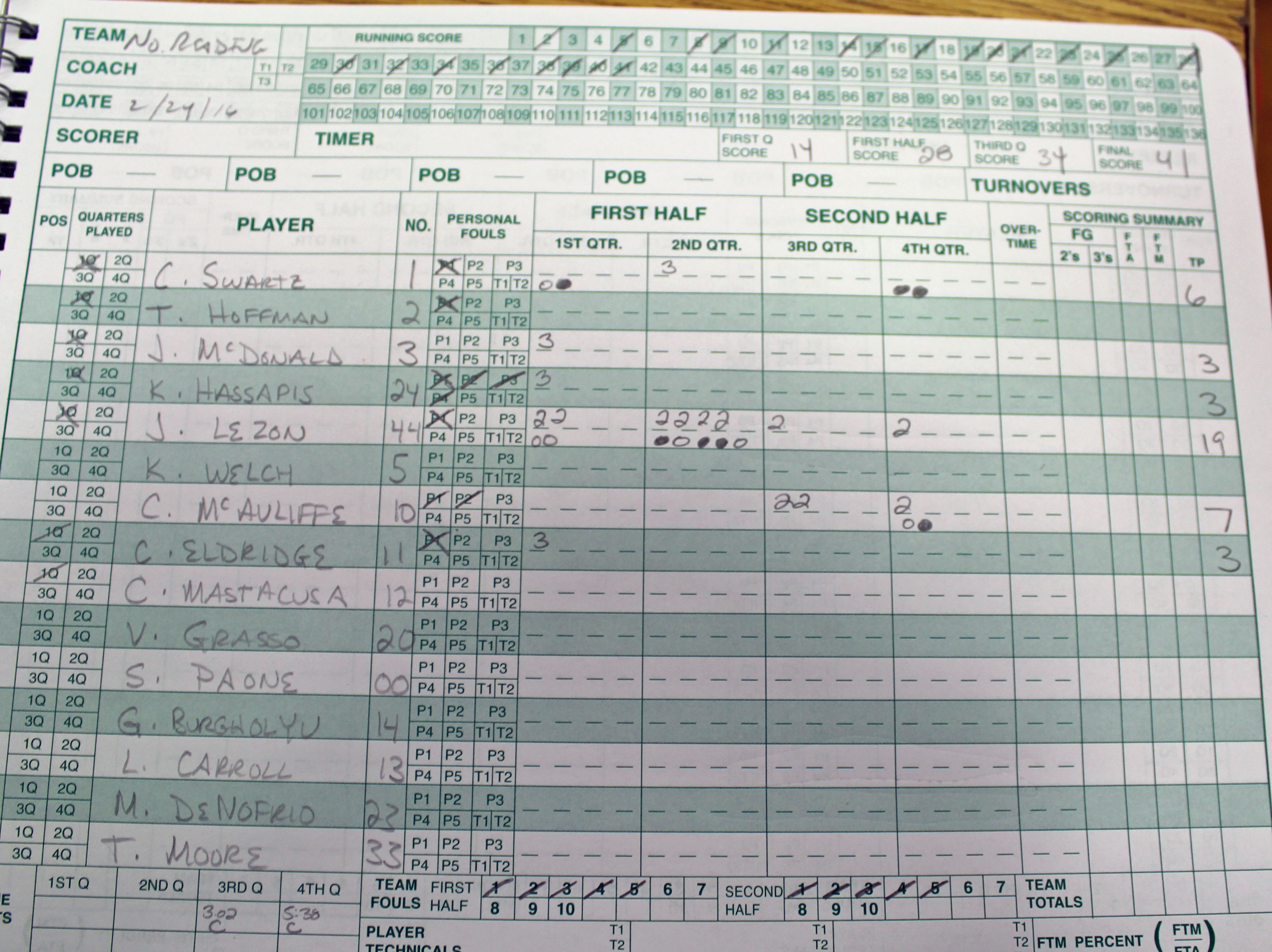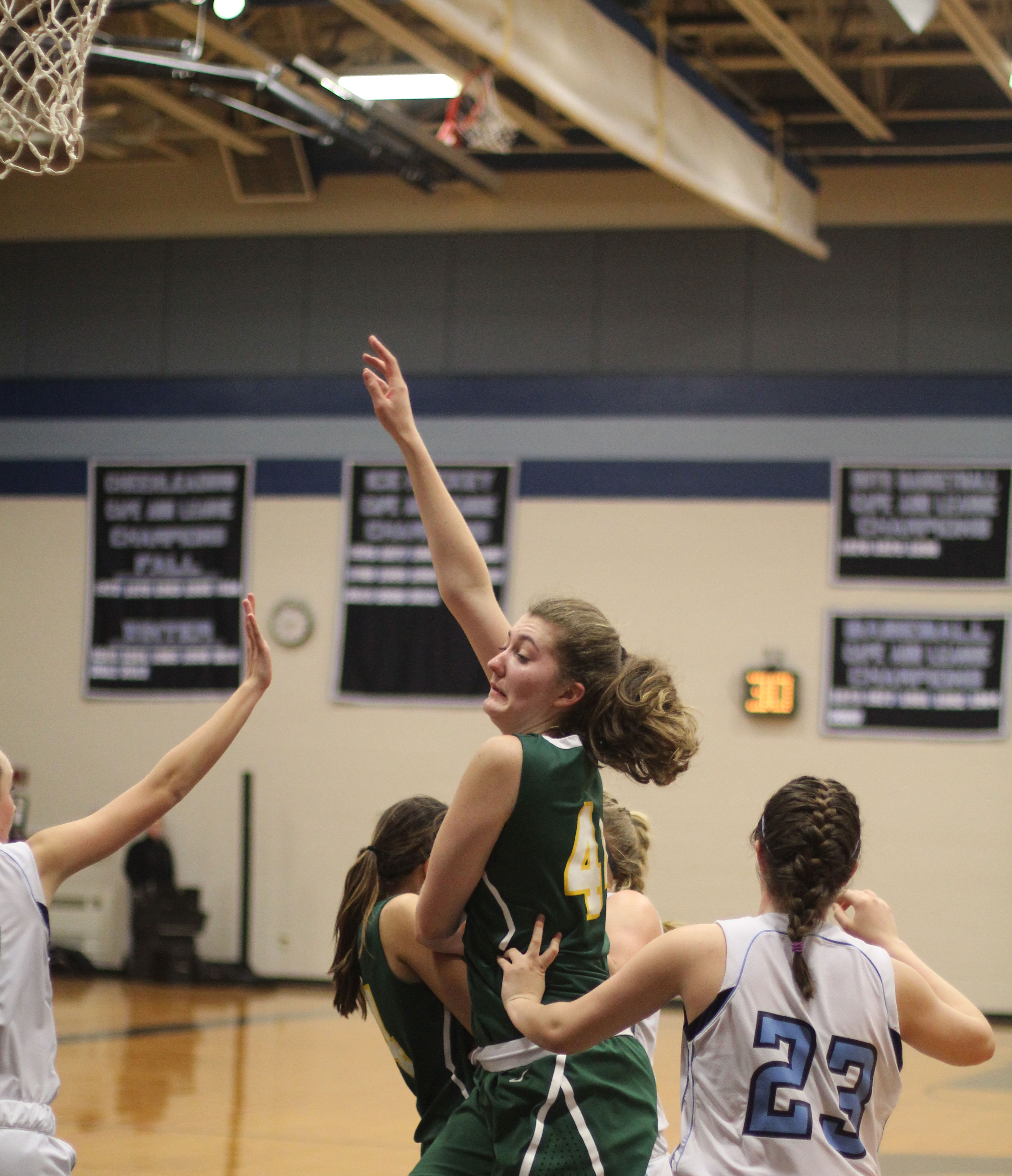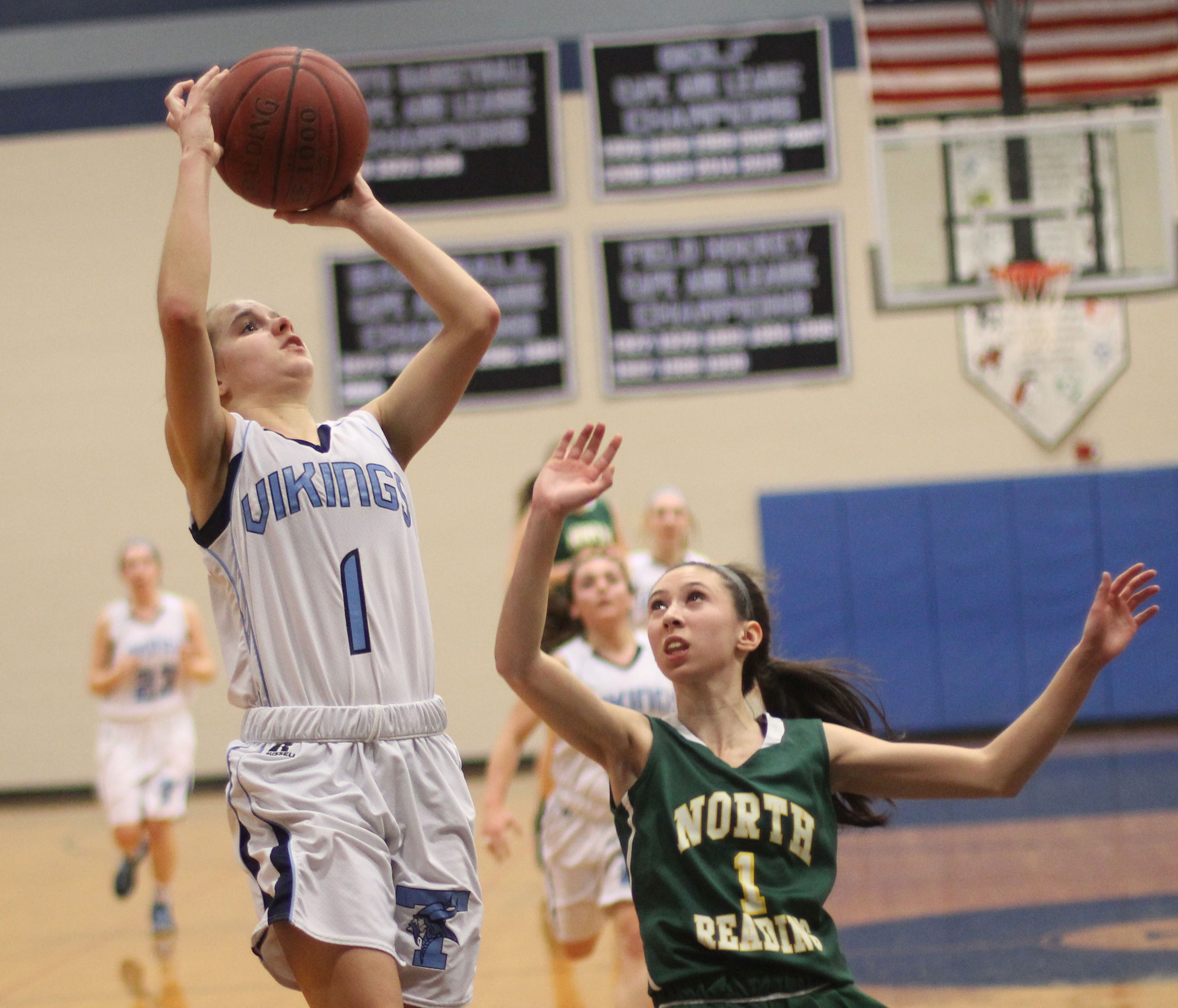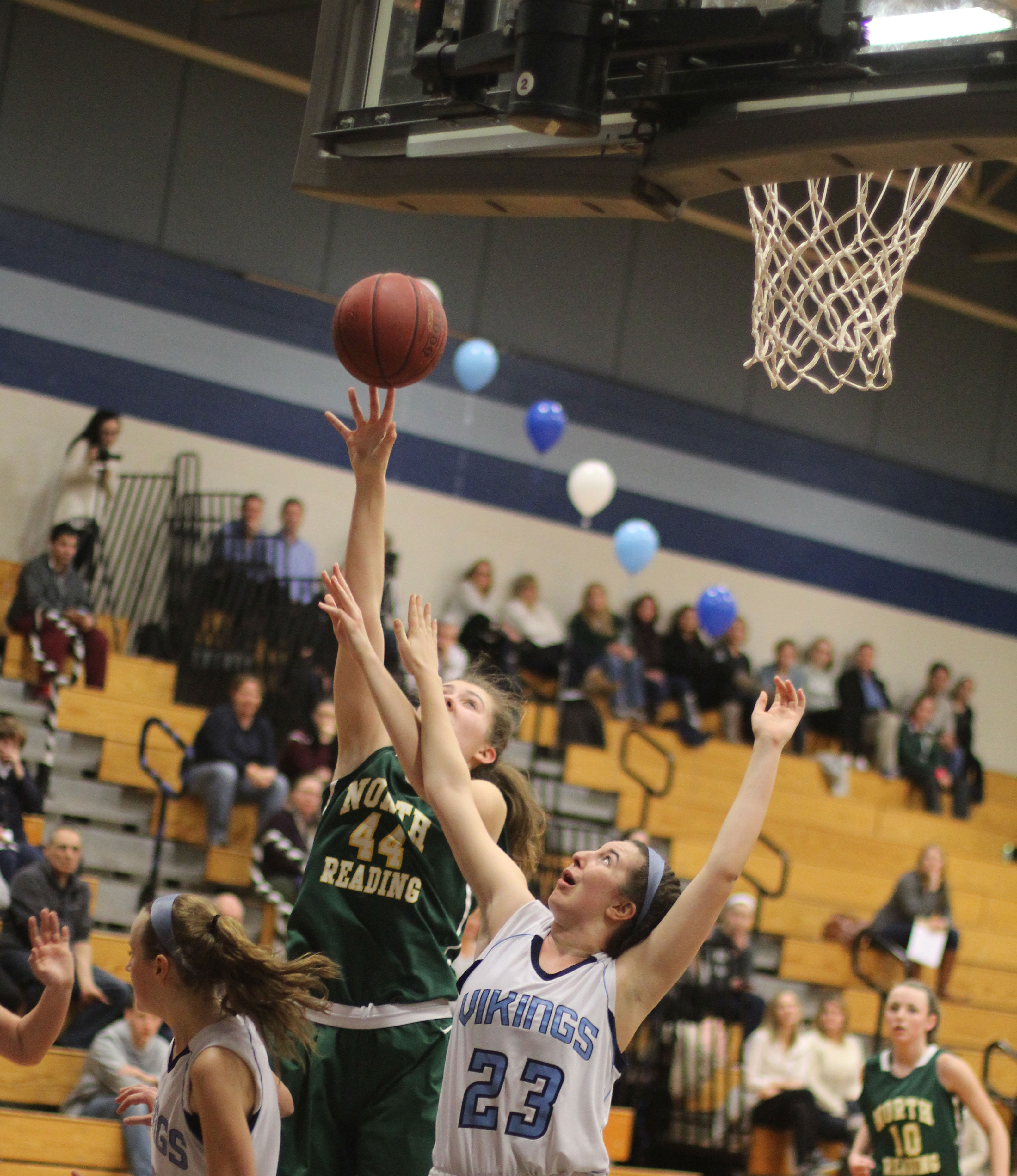 Jess Lezon (6’5”) drew plenty of Vikings defenders wherever she was. The Yale commit dominated the second quarter with eleven points getting terrific feeds from teammates. North Reading led 28-15 at halftime.