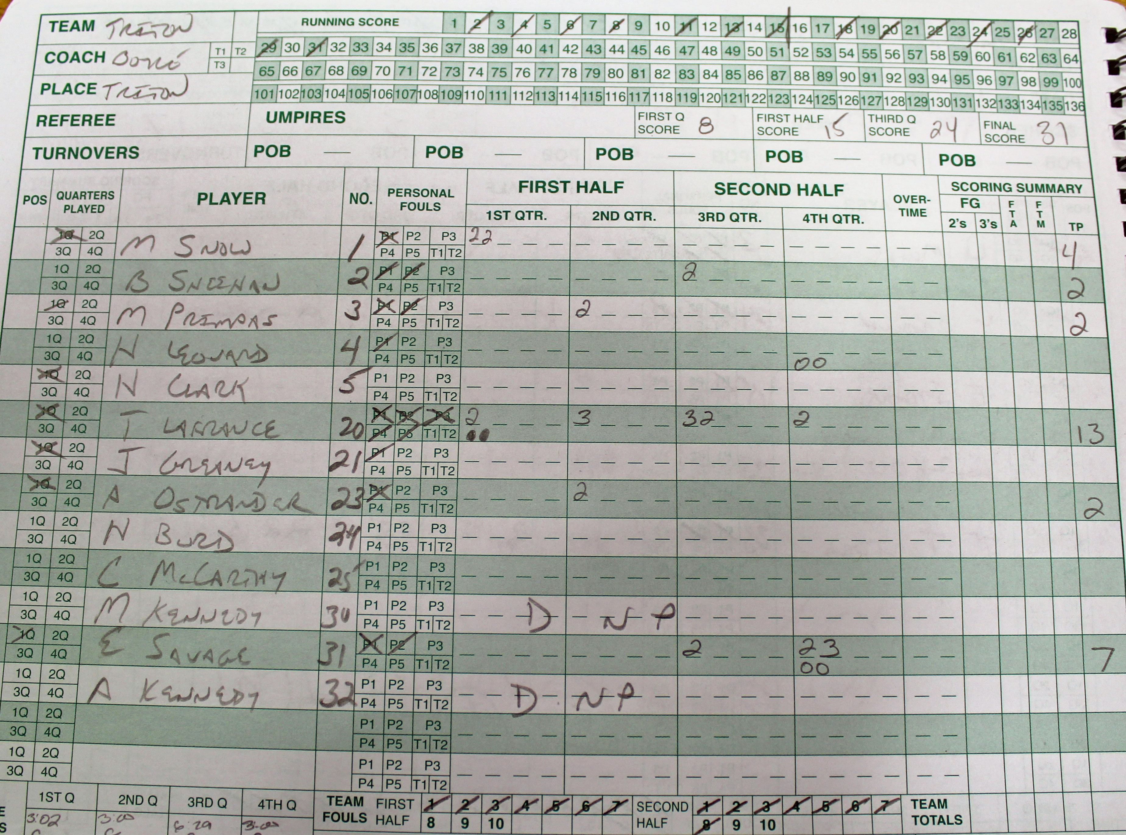 Junior Tessa Lafrance had thirteen points and defended Jess Lezon. Her problem? Foul trouble. If there is such a thing as a foul magnet, Tessa was it. Triton coach Dan Boyle was forced to keep the 6’ junior on the bench for half of the second quarter and didn’t start her in the 3rd quarter. Tough place to have your top scorer and your best defensive matchup against Jess Lezon.