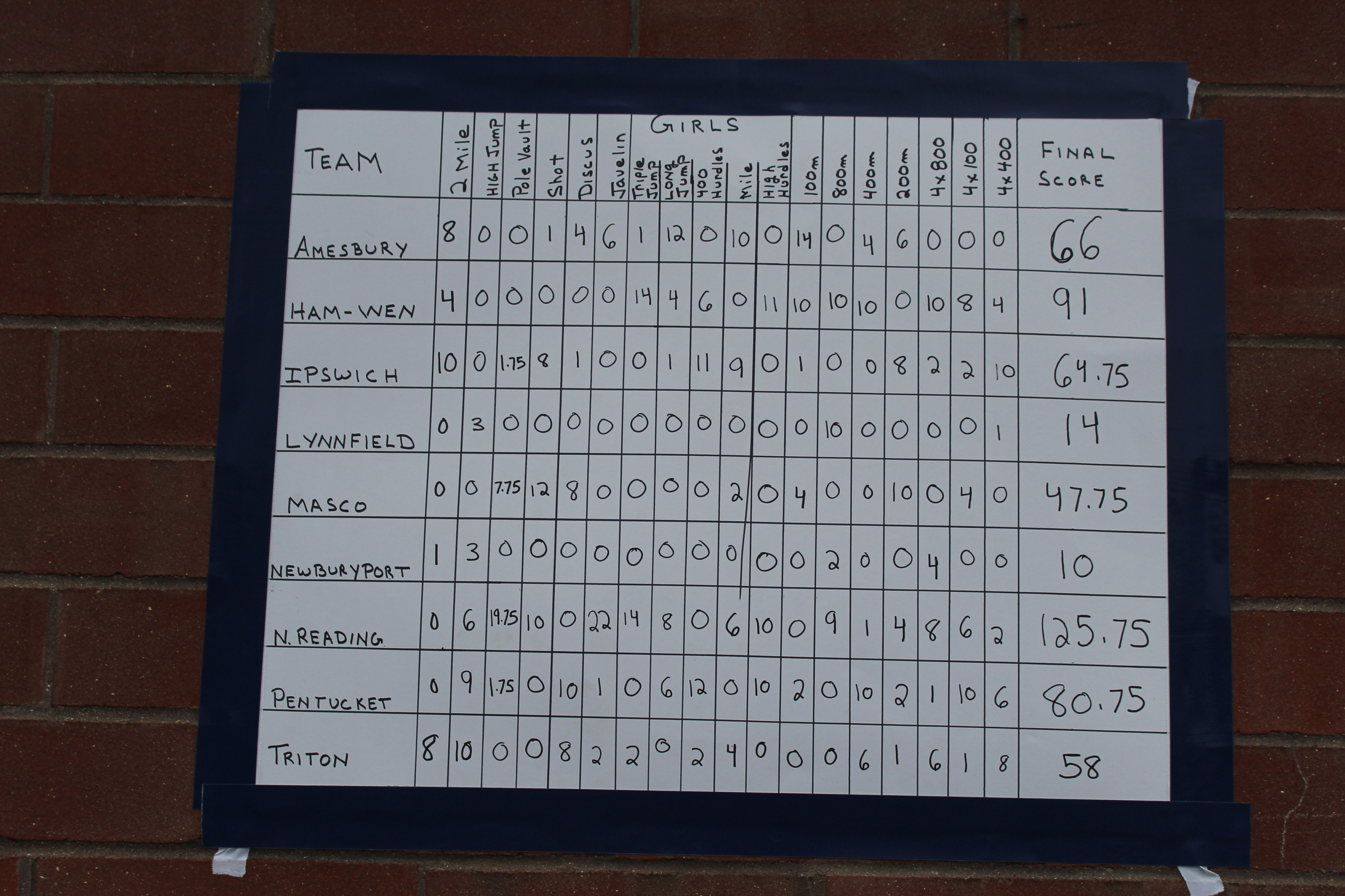 Amesbury held off second-place North Reading 113 to 100 while the NR girls had a 125.75 to 91 advantage over runner-up Hamilton-Wenham.