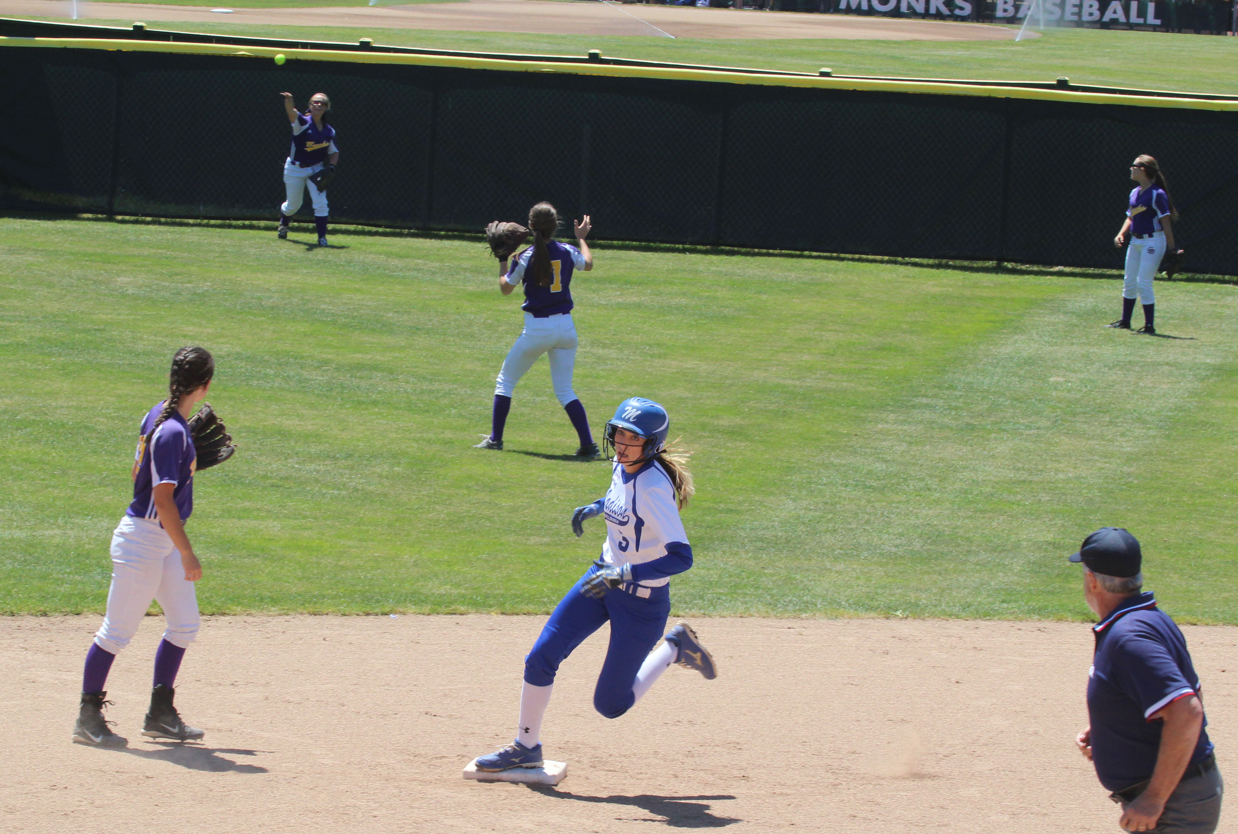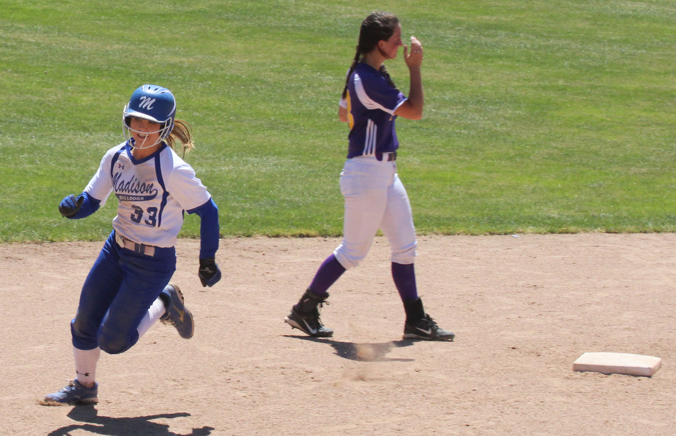 Aly LeBlanc about to reach third after driving in the go-ahead run for Madison