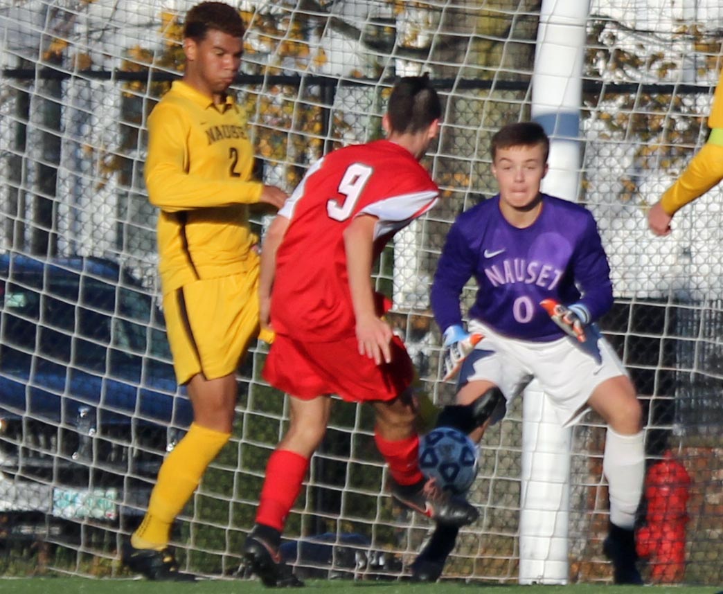 At 25:38 of the first half, Masco evened things. A wonderful pass by Bryan Gilbert from the right, set teammate Mike Budrewicz in the middle. My picture shows Mike with a good look and Nauset GK Jack Avellar hidden behind a defender. Mike kicked toward the left corner and Jack couldn’t see the shot at first and then couldn’t react fast enough when he did.