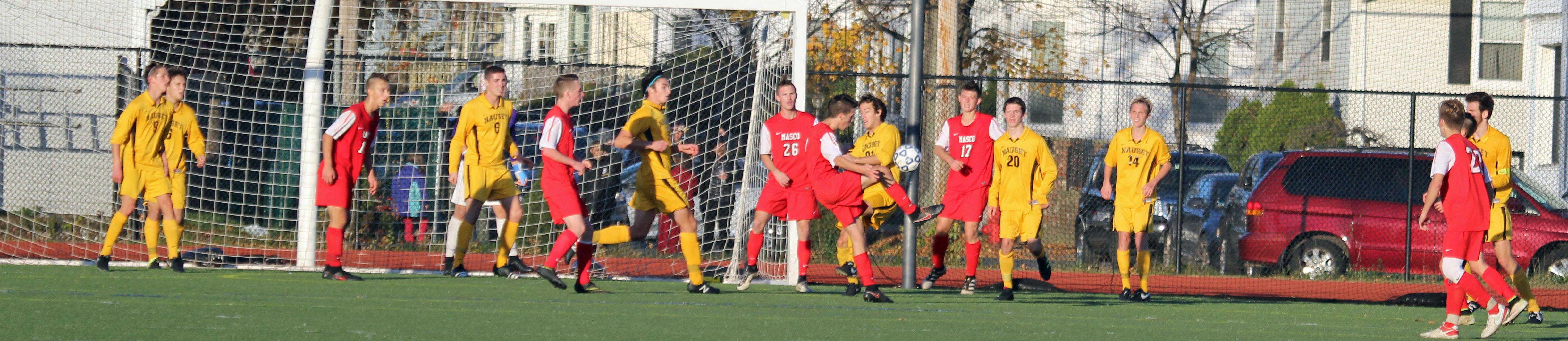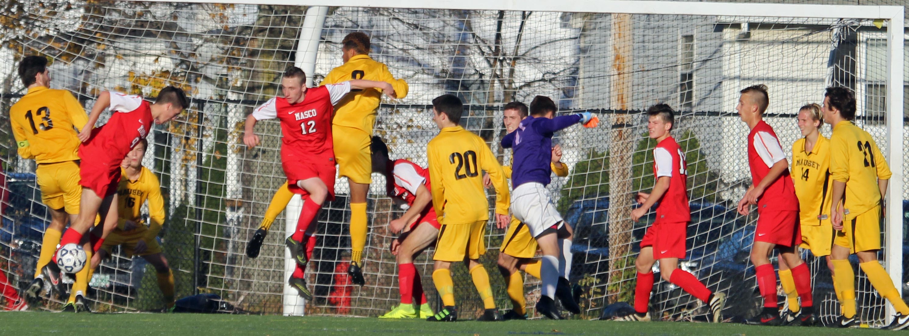 Nauset scored first early (37:44) in the first half. A direct kick from the left by Curtis Moore reached teammate James McCully unmarked out from the far post. James’ quick shot buzzed by Masco GK Derek Davidson’s left.