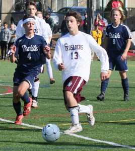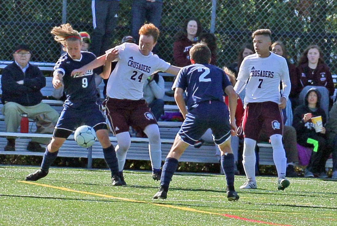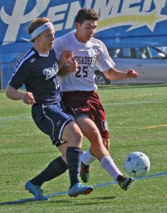 Turning point in this game?  First minute of the second half.  Down 1-0, Littleton’s 20-goal scorer Danny Kubkowski blasted a shot past Profile GK Jordan Brusseau.  The scoreboard changed as the Crusaders’ celebrated.  But then came the bad news: someone had been offside.  Off came the goal and the momentum that would have come with it.