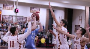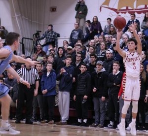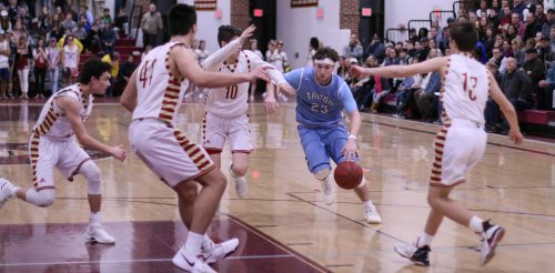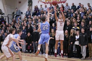 Triton was down but not out. They scored the next ten points and they did it in a hurry. In one minute of playing time, the visitors from Byfield, put that ten-spot together. Kyle Odoy ended the 3rd quarter with a layup and then picked off an inbounds pass and put in two more. Junior Dylan Shute contributed an old-fashioned 3-point play and then Will Parsons nailed one from beyond the arc.