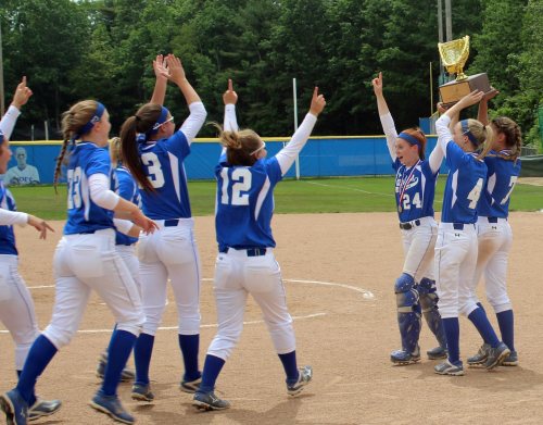 The Class C title celebration begins around pitcher Lauria LeBlanc