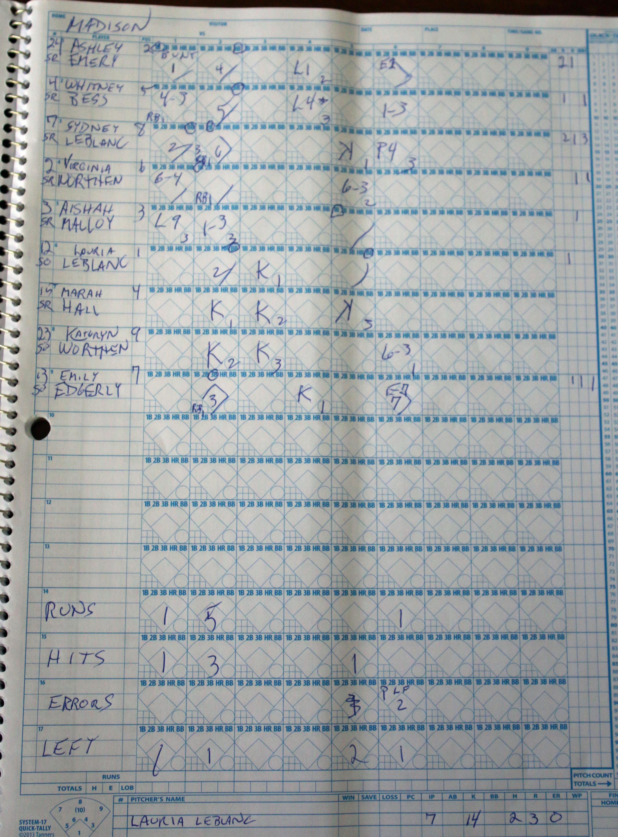 I am posting my scorebook.  Understand that I was nearly 100 yards from the official scorer.