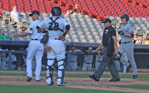The play that riled up the manager happened in the second inning. CT had a runner on second with one out.  The batter struck out but the 3rd strike was dropped as the runner on second tried to steal third.  The catcher threw to third too late.  The third baseman then threw to first trying to get the struck-out batter.  The first baseman caught the ball but lost it as the runner ran into the tag dislodging the ball.  The runner on third scored.  I guess the manager had several reasons to be upset!