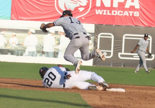Cather Moises Nunez (20) slides under shortstop Eduardo Torrealba (13)