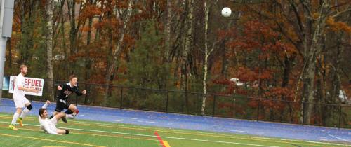 Sunapee goalie Justin Claus (52) up to clear a corner kick