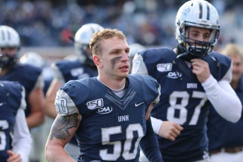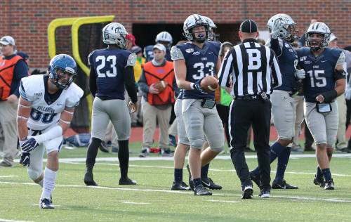 Efficient use by Villanova of timeouts (an issue in an earlier loss) gave the visitors possession in a one-possession game (28-20) at their twenty with 1:49 left and no timeouts. Daniel Smith used time-stopping sidelines passes and a long scramble to reach the New Hampshire thirty-two with twenty seconds left. A pass attempt down the middle, however, was overthrown and defender Evan Horn intercepted and sealed the win for the home team.