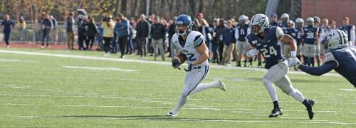 NH freshman back Dylan Laube twice swung out of the Wildcats backfield to beat Nova defenders deep. In the third quarter, Dylan escaped senior Julian Williams to give NH the lead for good, 21-20. In the fourth quarter, Dylan added an insurance score. This time it was linebacker Drew Wiley who was burned deep.