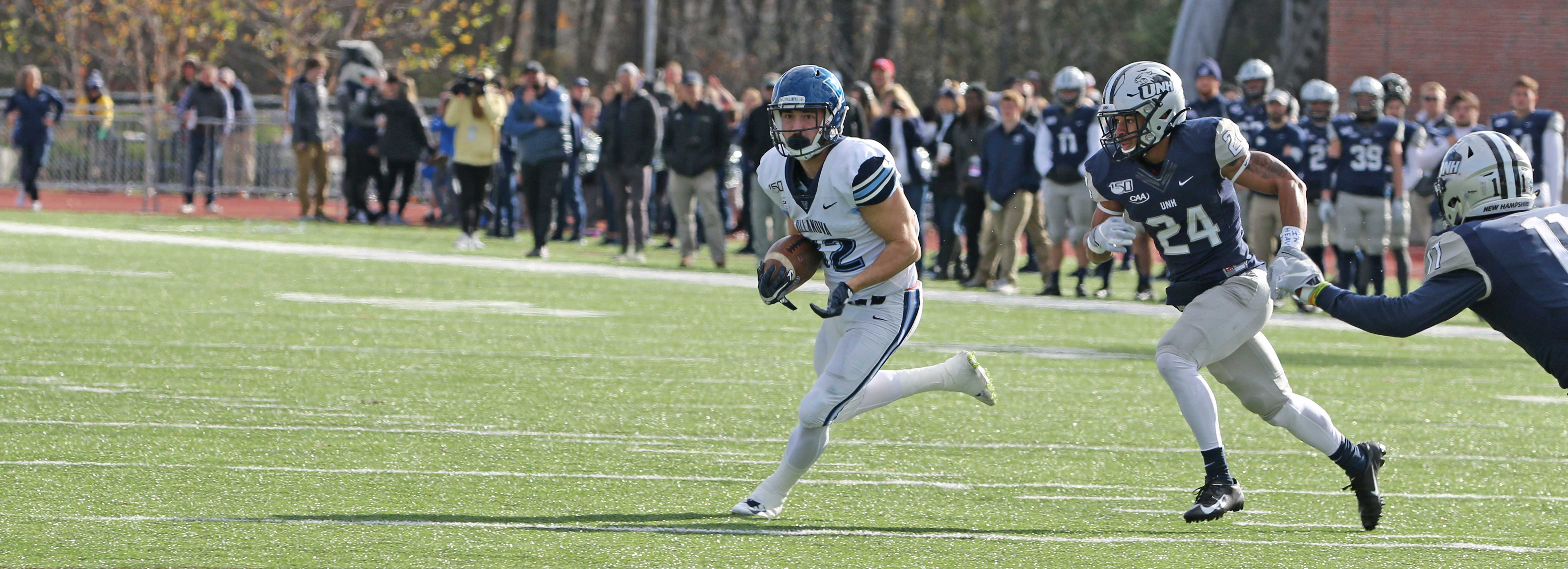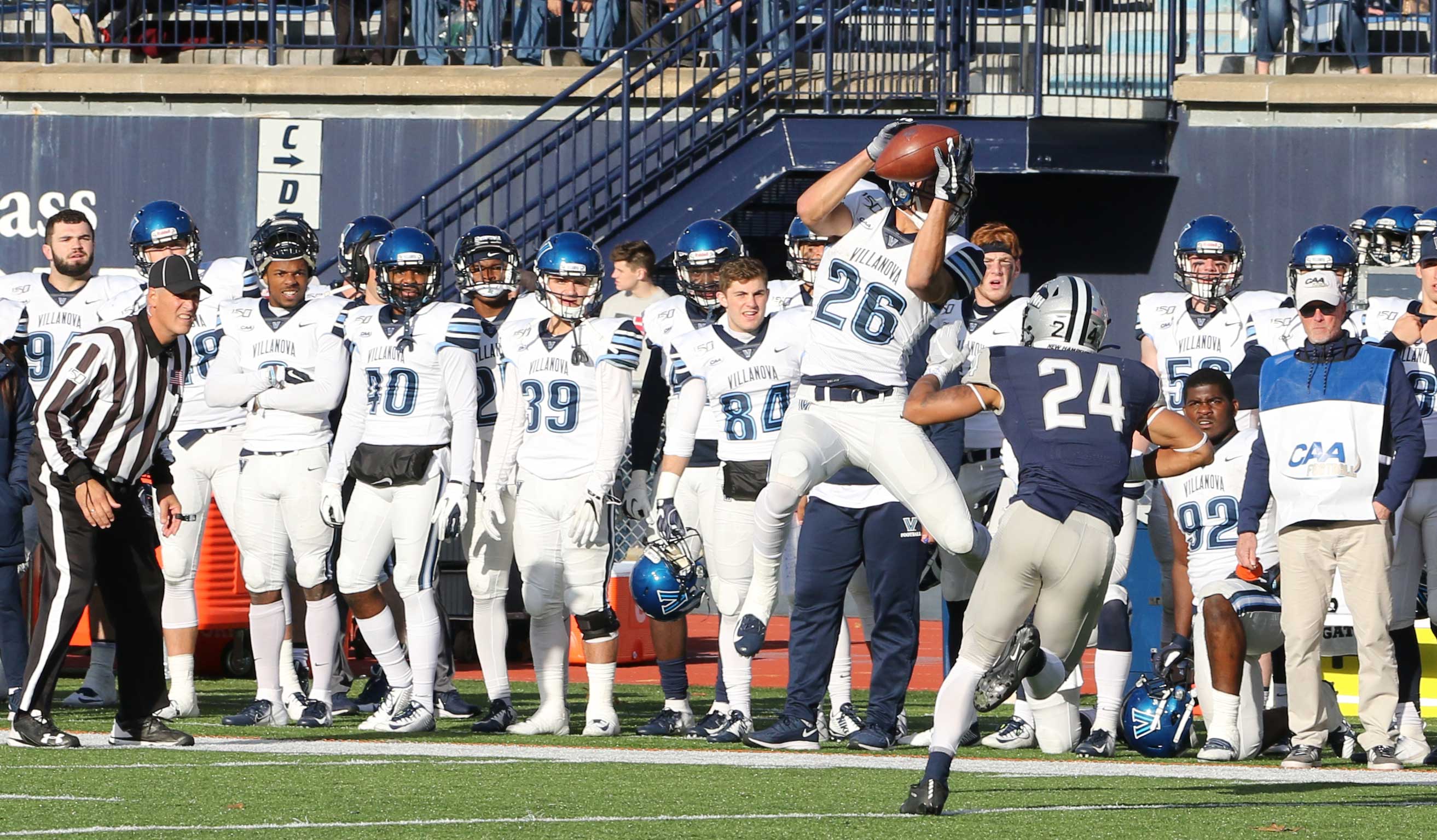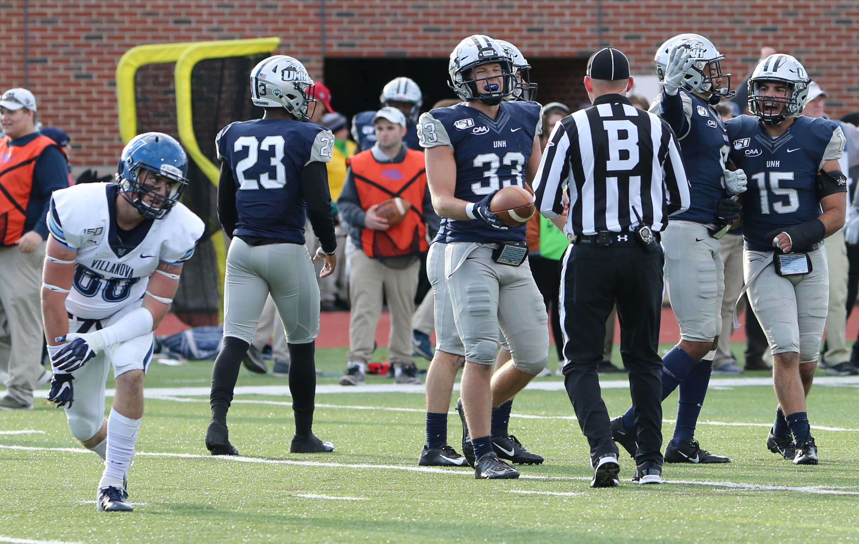 Efficient use by Villanova of timeouts (an issue in an earlier loss) gave the visitors possession in a one-possession game (28-20) at their twenty with 1:49 left and no timeouts. Daniel Smith used time-stopping sidelines passes and a long scramble to reach the New Hampshire thirty-two with twenty seconds left. A pass attempt down the middle, however, was overthrown and defender Evan Horn intercepted and sealed the win for the home team.