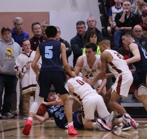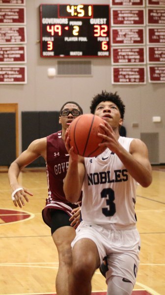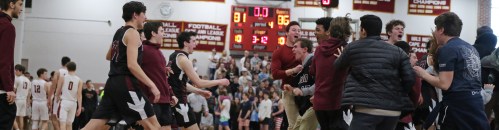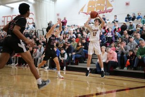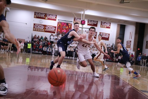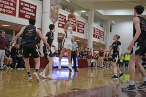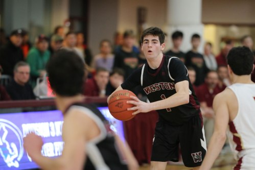 Wide open on the left side, in front of the Weston partisans, was junior Will Van Houten (24 points). Will had time (and courage) to take and make the open three with fifteen seconds left. Now down by five (85-80) Newburyport lacked the time and accuracy to recover.