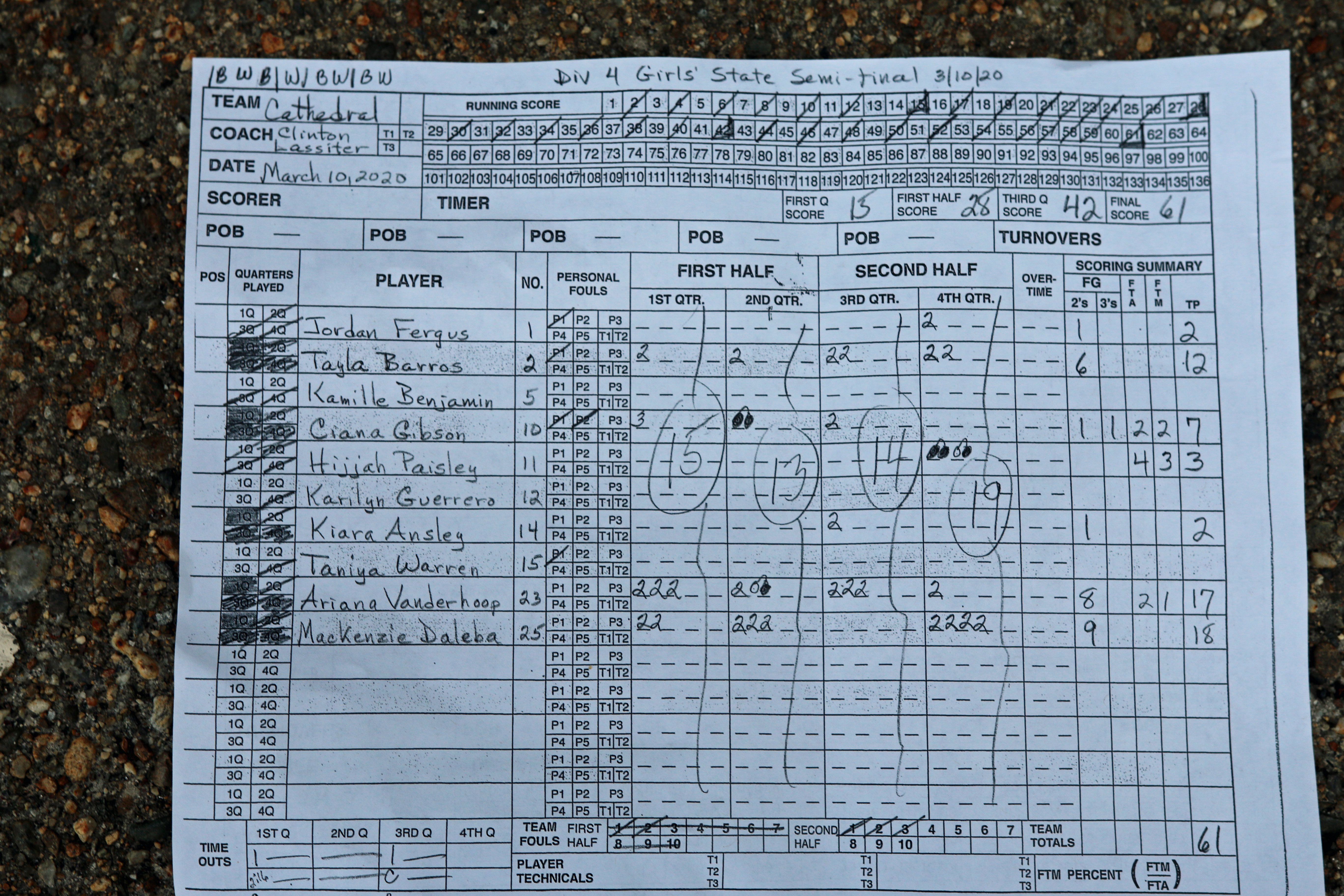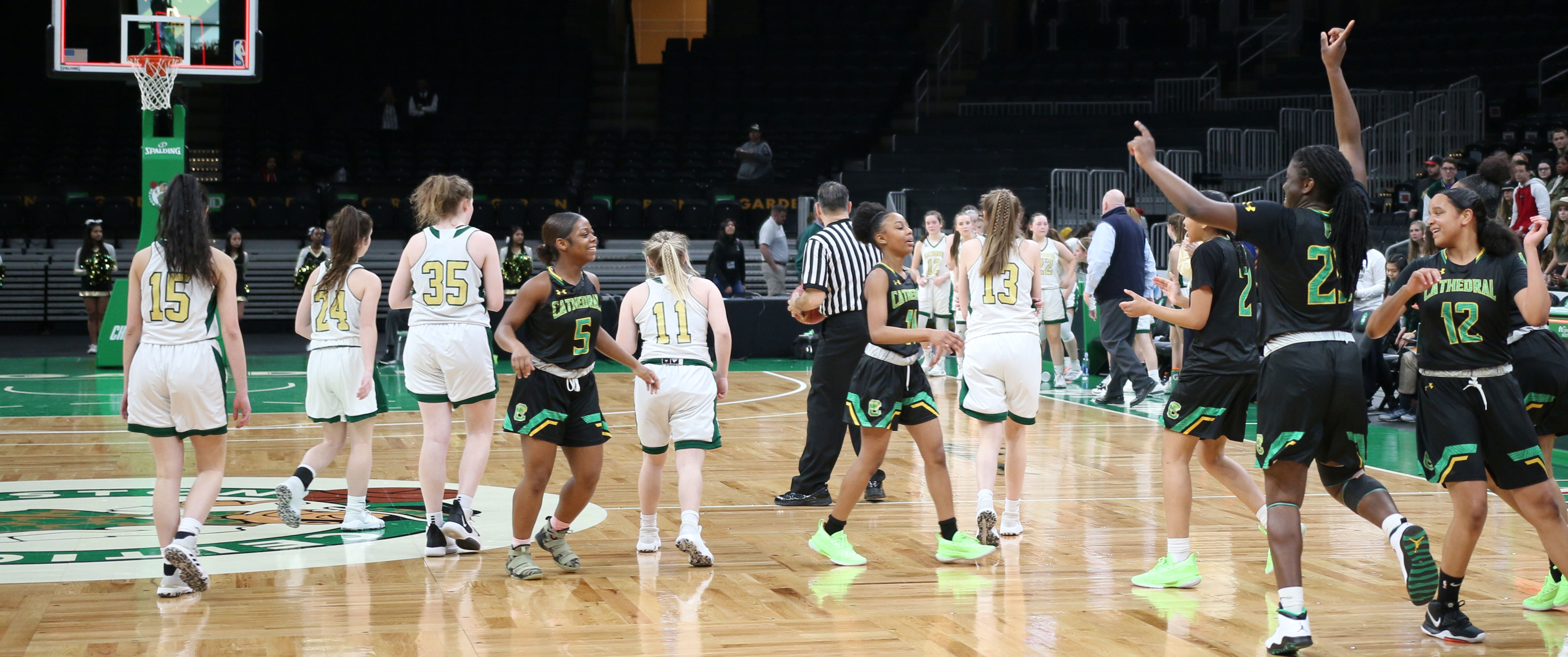 During the 11-point run, Cathedral had two inside scores from senior Mackenzie Daleba (18 points), plus fast break layups by Tayla Barros (12 points) and Ariana Vanderhoop (17 points). CeCe Gibson (7 points) finished the run of points with a three from the right side.