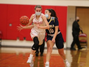 The Pioneers had a six-point lead (26-20) three minutes into the 3rd quarter but two 3’s by senior Mary Bullis (assisted by Liv DeLong) brought Amesbury even.  Liv’s cross-court passes gave Mary open looks against Lynnfield’s zone defense.