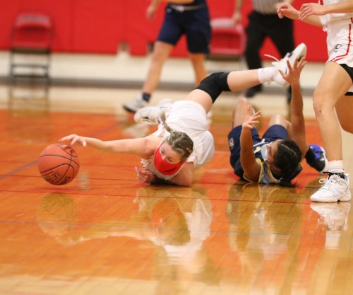 McKenna Hallinan and Bella George go to the floor for a loose ball
