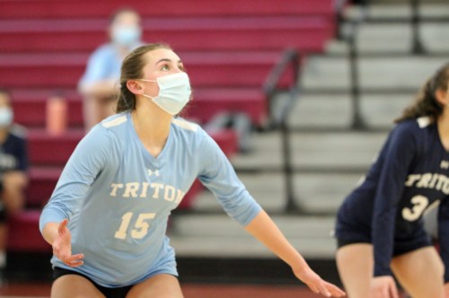 “In the first set we were all over the place,” explained Triton senior Evelyn Pearson. “After that we settled down and covered a lot more. We started diving. Volleyball is all about coverage and communication.”