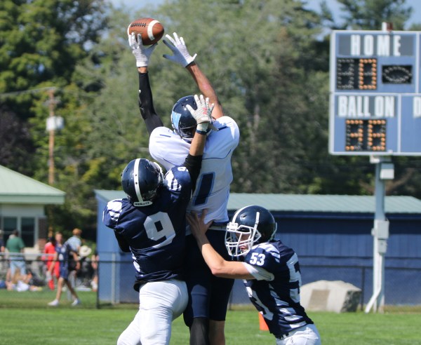 Battle in the air between Westbrook’s Aidan Taylor and FA’s Caleb Micklon and Gabe McKenney