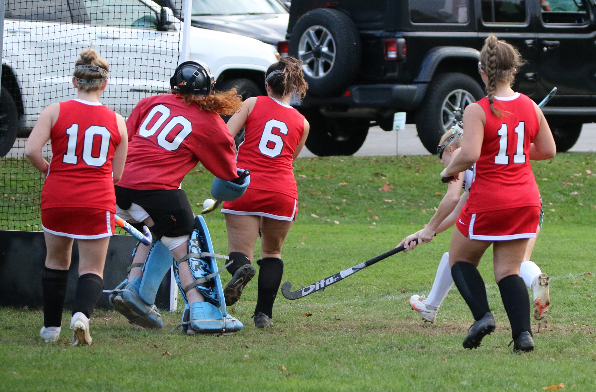 When Haley got close to the endline, she sent a pass across the front of the net between the goalie and a defender.