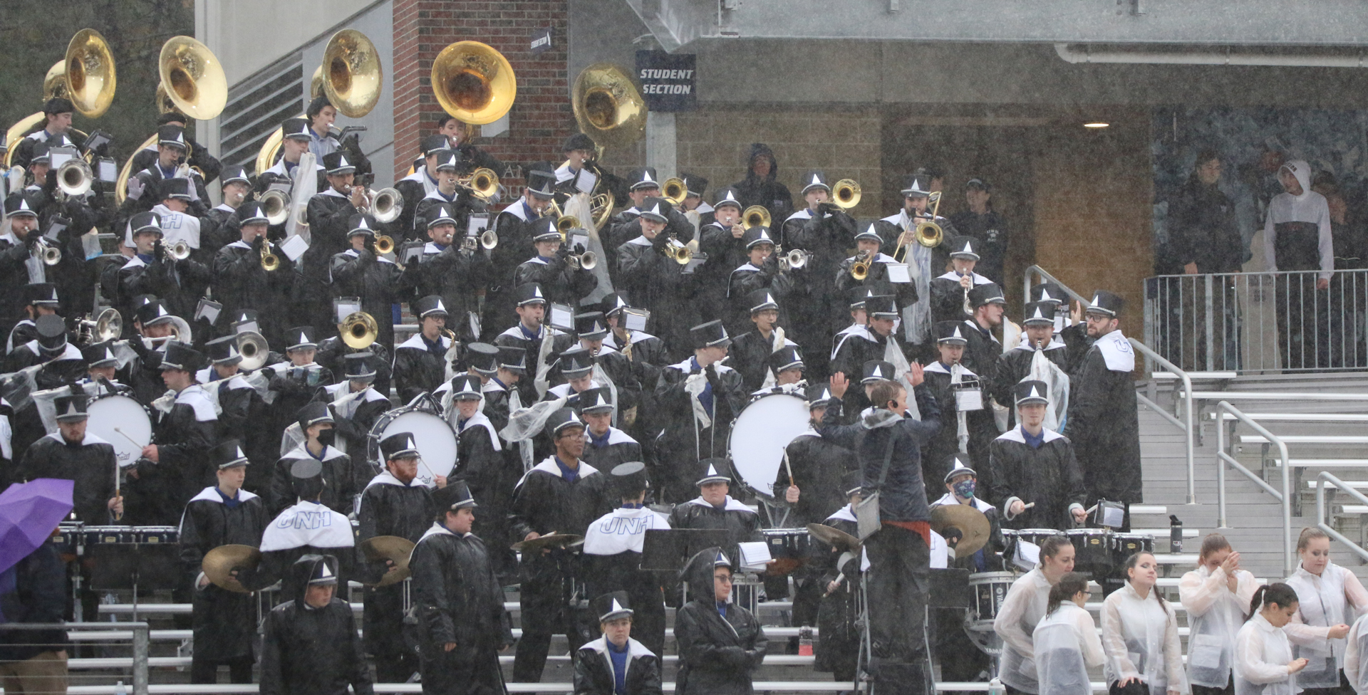 I have to credit the UNH band.  They were on the field before the game, and it was raining.  They were on the field at halftime, and it was raining.  When they weren’t on the field, they were in their section until the very end, and it never stopped raining.  Dedication?