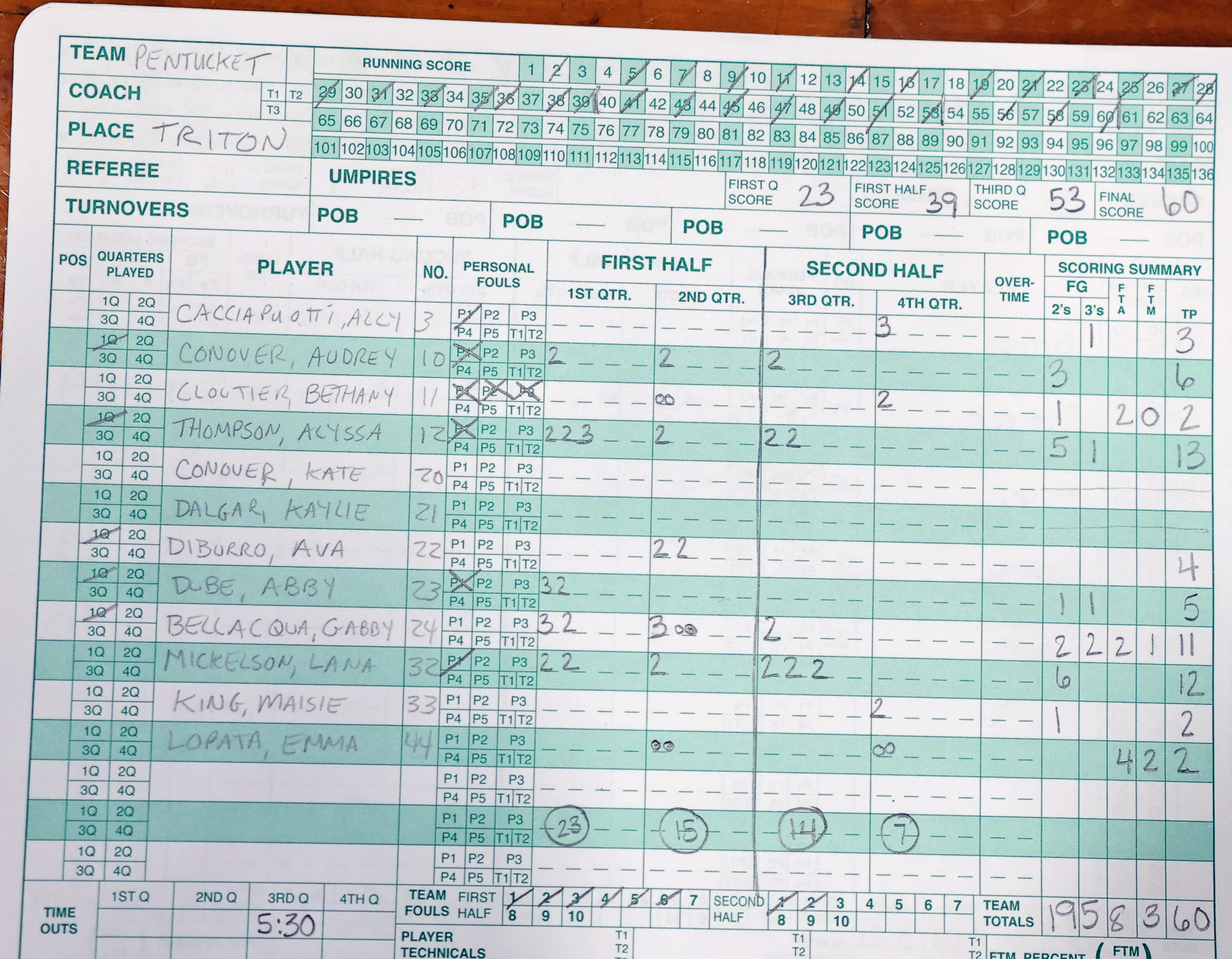 Alyssa Thompson (13), Lana Mickelson (12), and Gabby Bellacqua (11) reached double figures for Pentucket.