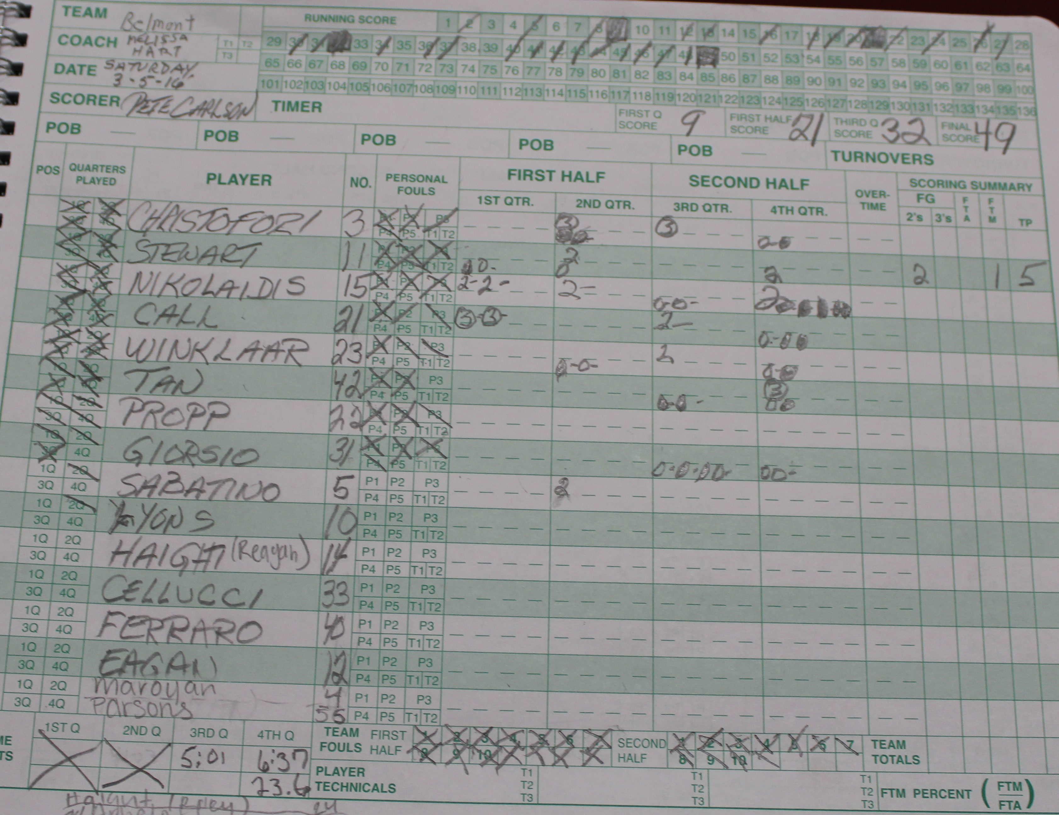 Appearing to be down and out (32-23) with 3:40 to go in the third quarter, the Clippers put twelve unanswered points together over the next six minutes of playing time to take the lead, 35-32, 2+ minutes into the final quarter. During that stretch, Belmont turned ice cold from everywhere, including the foul line, where they missed all five FT attempts.