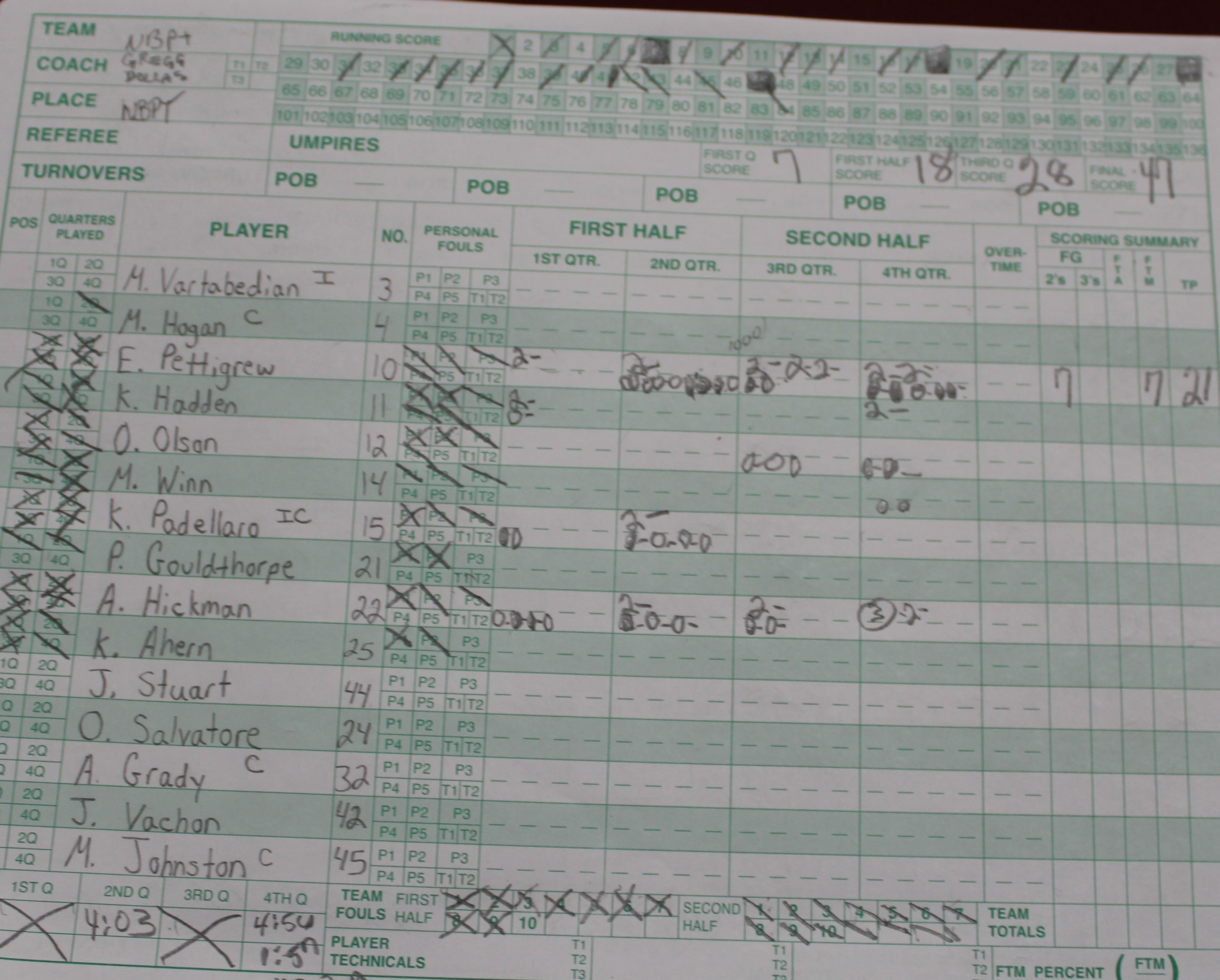 I know I’m beating this free throw thing to death but in the last 1 ½ minutes of the 2nd quarter Newburyport missed seven straight foul shots. That they only trailed by three (21-18) at the half is indicative of the type of defense they were playing.