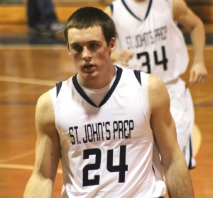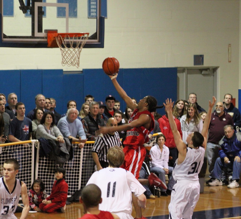 The most controversial play of the game followed and the way the Eagles reacted to it almost cost them the game. An Eagle player (It looks like Freddy Shove in my picture to the left.) went in for a layup and Jimmy Zenevitch either deflected the shot or goal tended. There wasn’t a soul in the house with Eagle connections that wasn’t sure that the basket should have counted because of a goal tend. When it wasn’t called the St. John’s coaching staff erupted and Eagle coach Sean Connolly got whistled for a technical foul after brushing an official. (Never a good idea down the stretch in a tight game.)