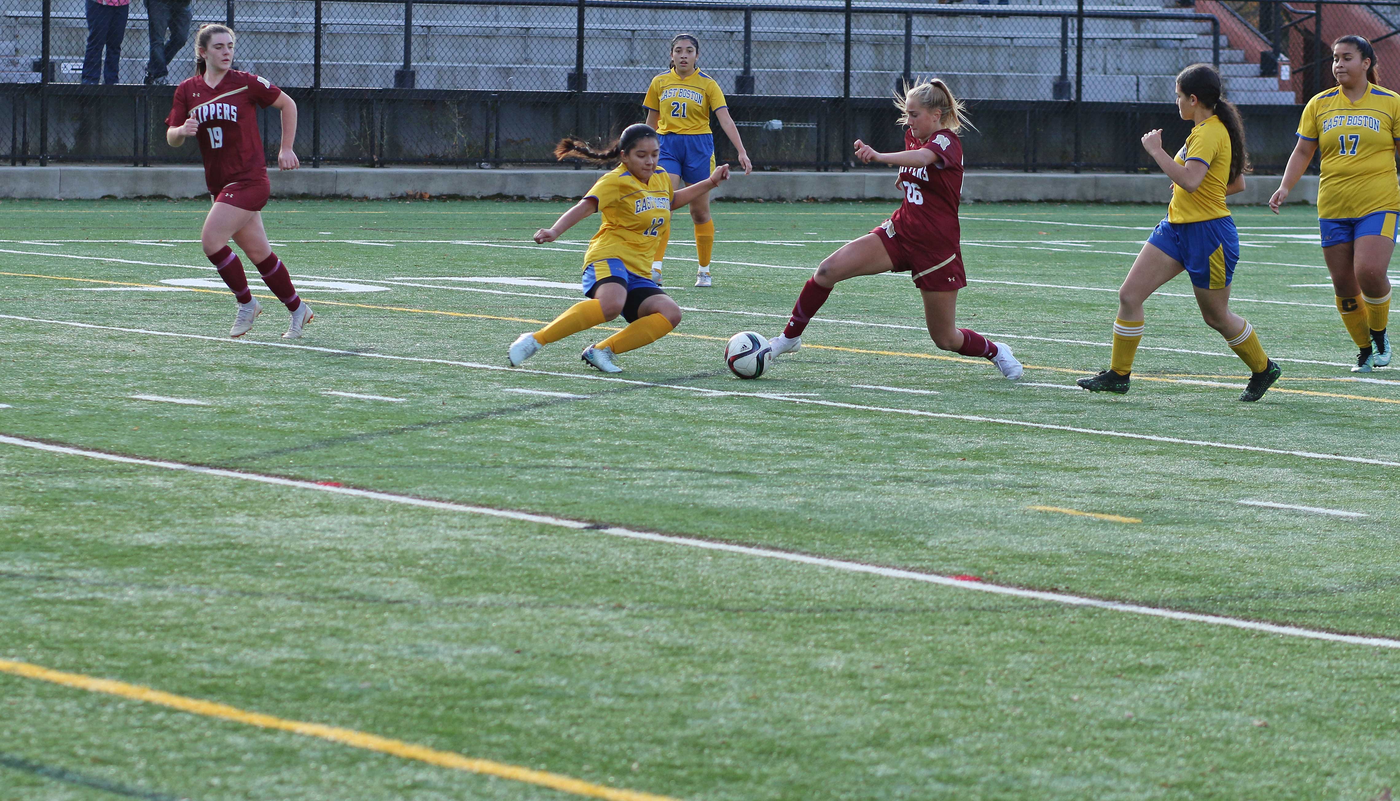 East Boston goalie Julianna Bonilla made some nice saves but also left some big rebounds.