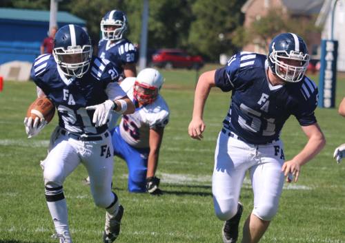 Quarterback Gunnar Saunders led the Raiders. The FA sophomore rushed for one score and passed to Caleb Micklon for two others. Gunnar also connected with Caleb for a two-point conversion.
