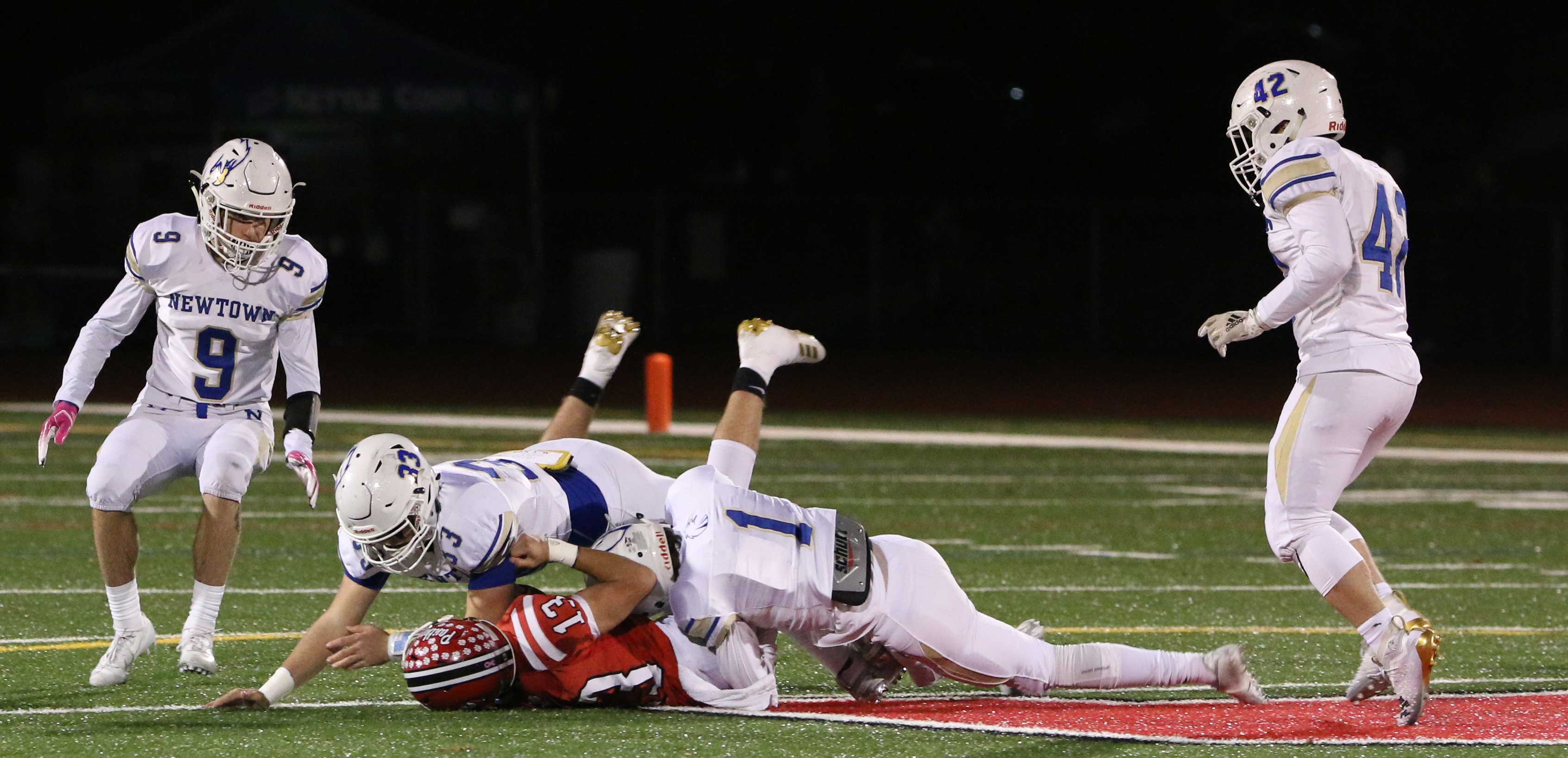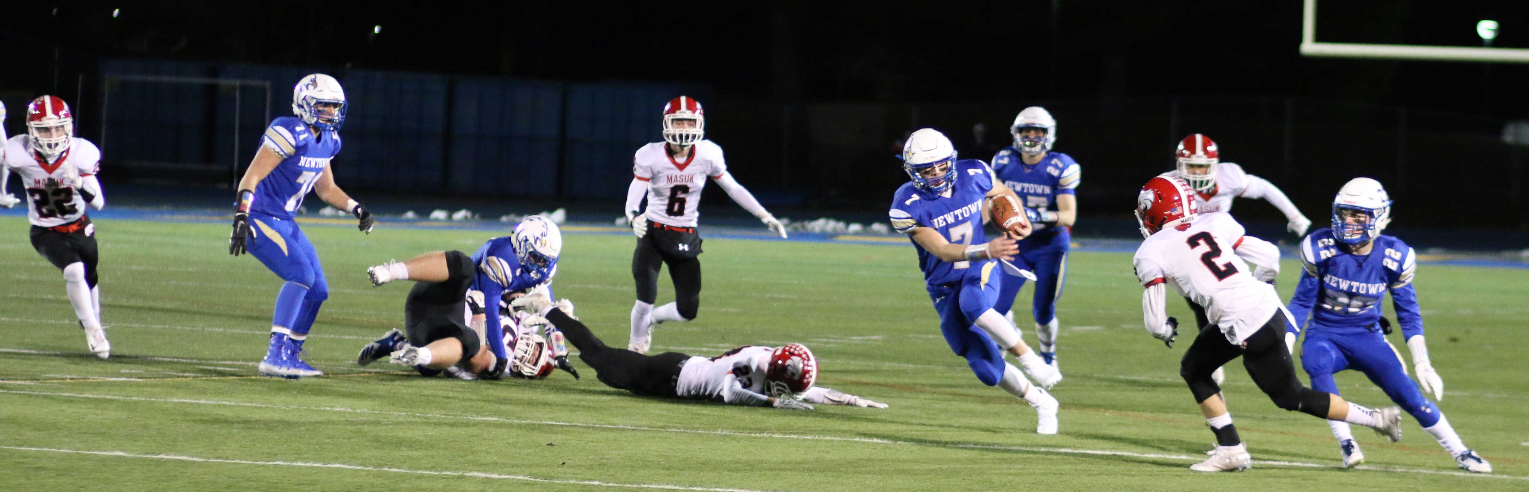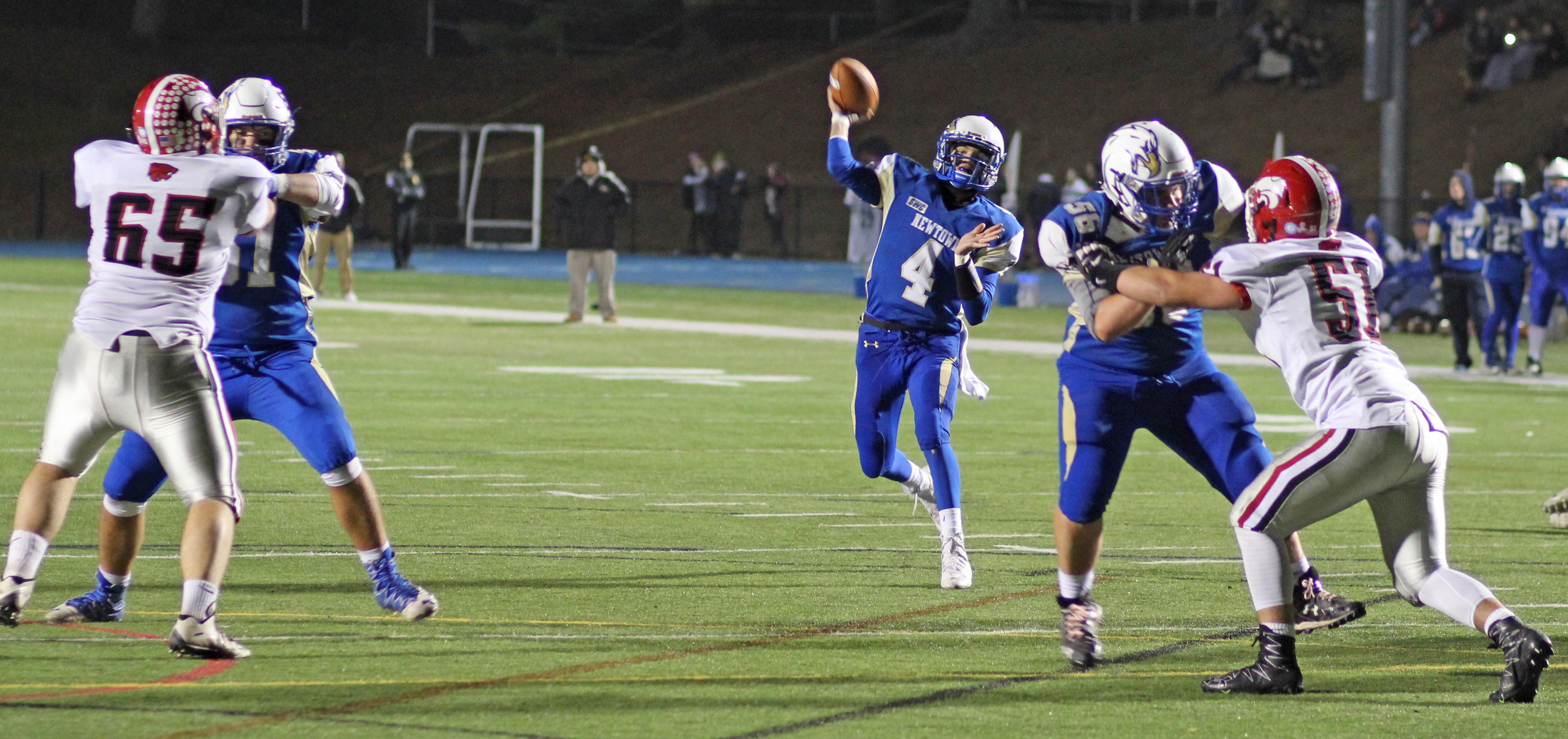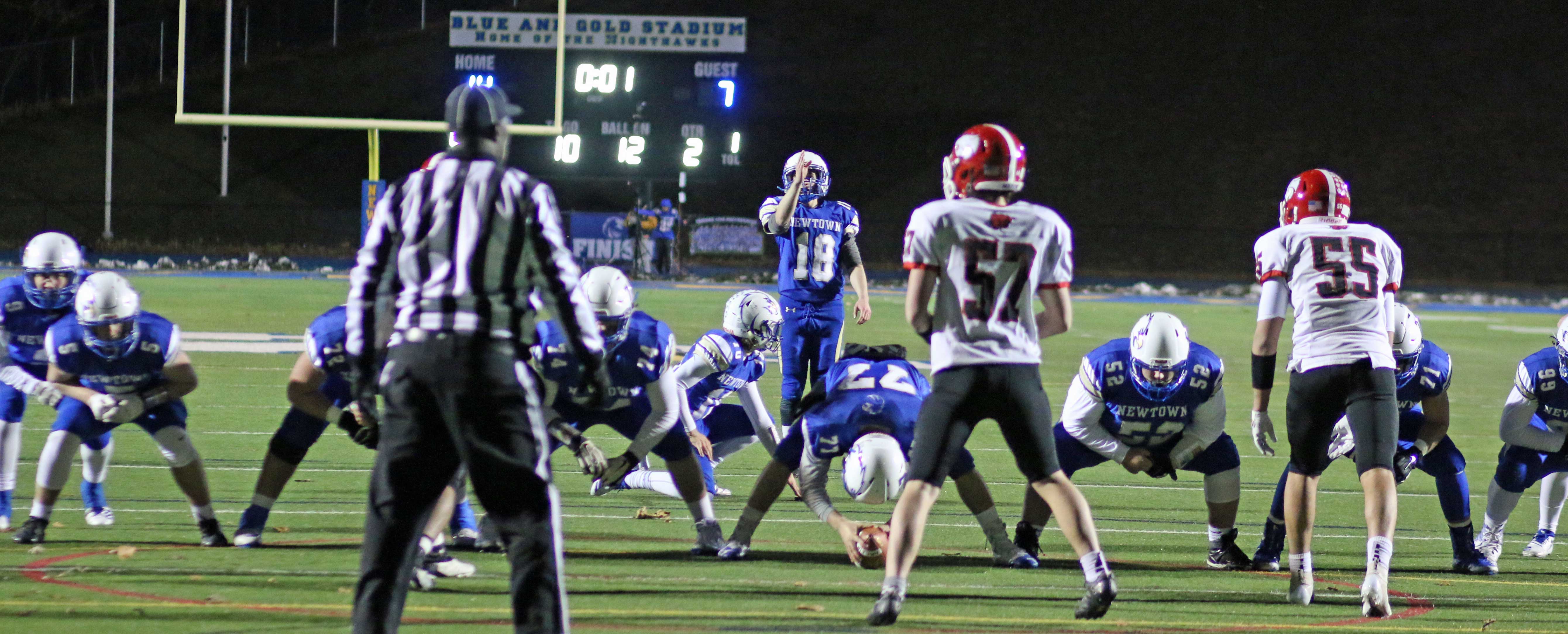And it needed to be after a third-quarter bad snap resulted in a safety (5:03) as senior Colin Meropoulos dropped quarterback Jack Street in the end zone. The Newtown lead was now only 7-2 with seventeen minutes of playing time left.