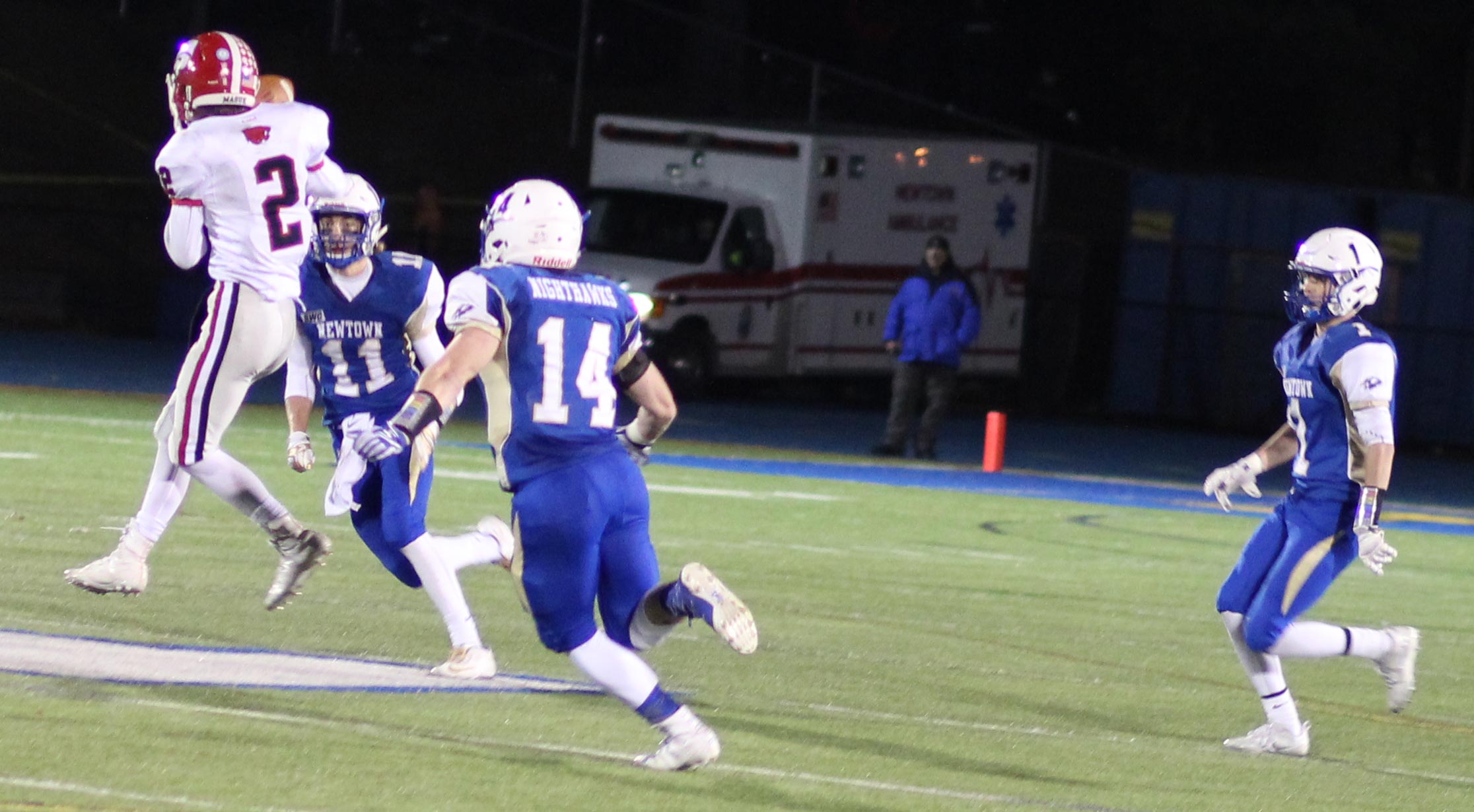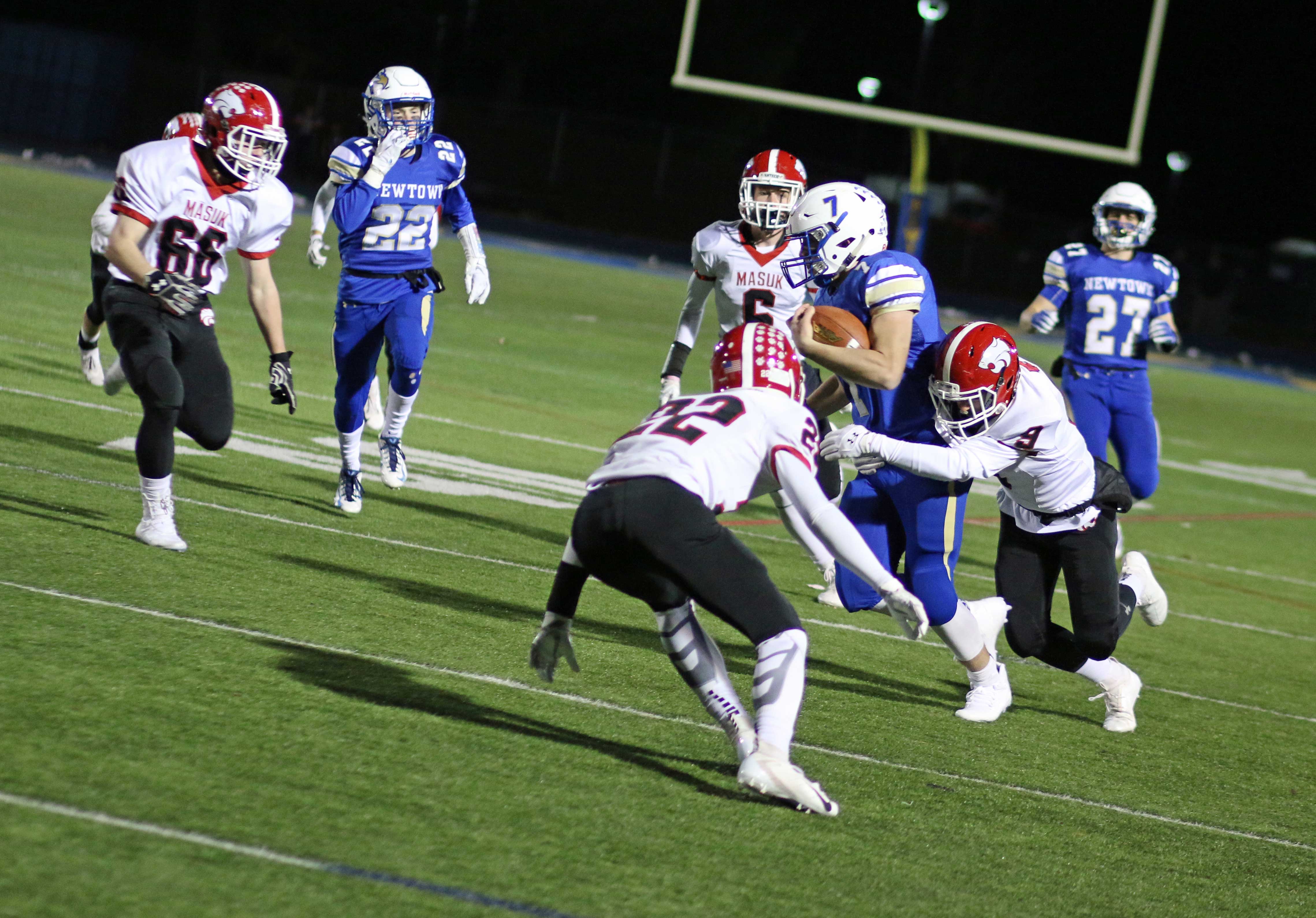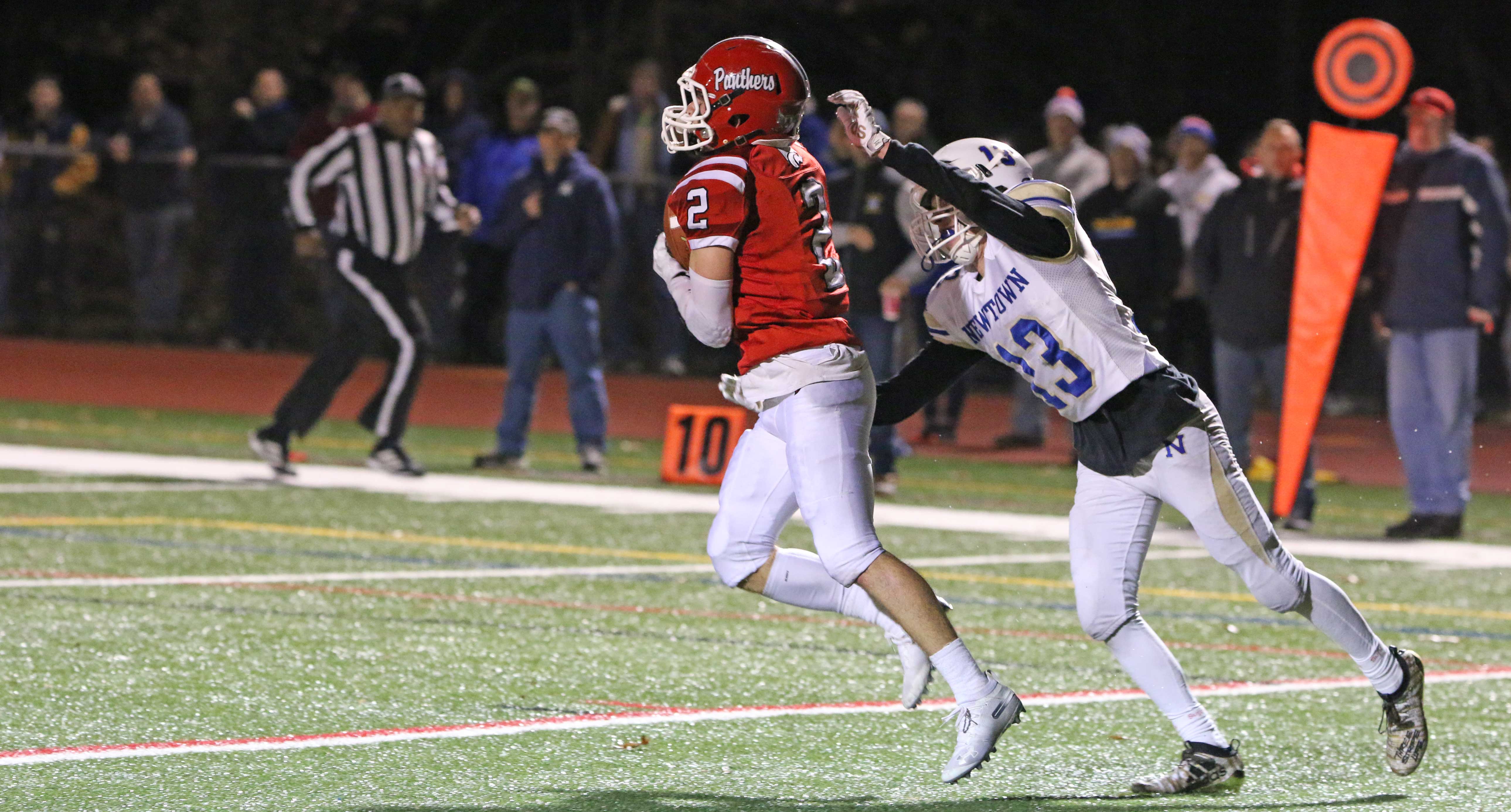 And it needed to be after a third-quarter bad snap resulted in a safety (5:03) as senior Colin Meropoulos dropped quarterback Jack Street in the end zone. The Newtown lead was now only 7-2 with seventeen minutes of playing time left.