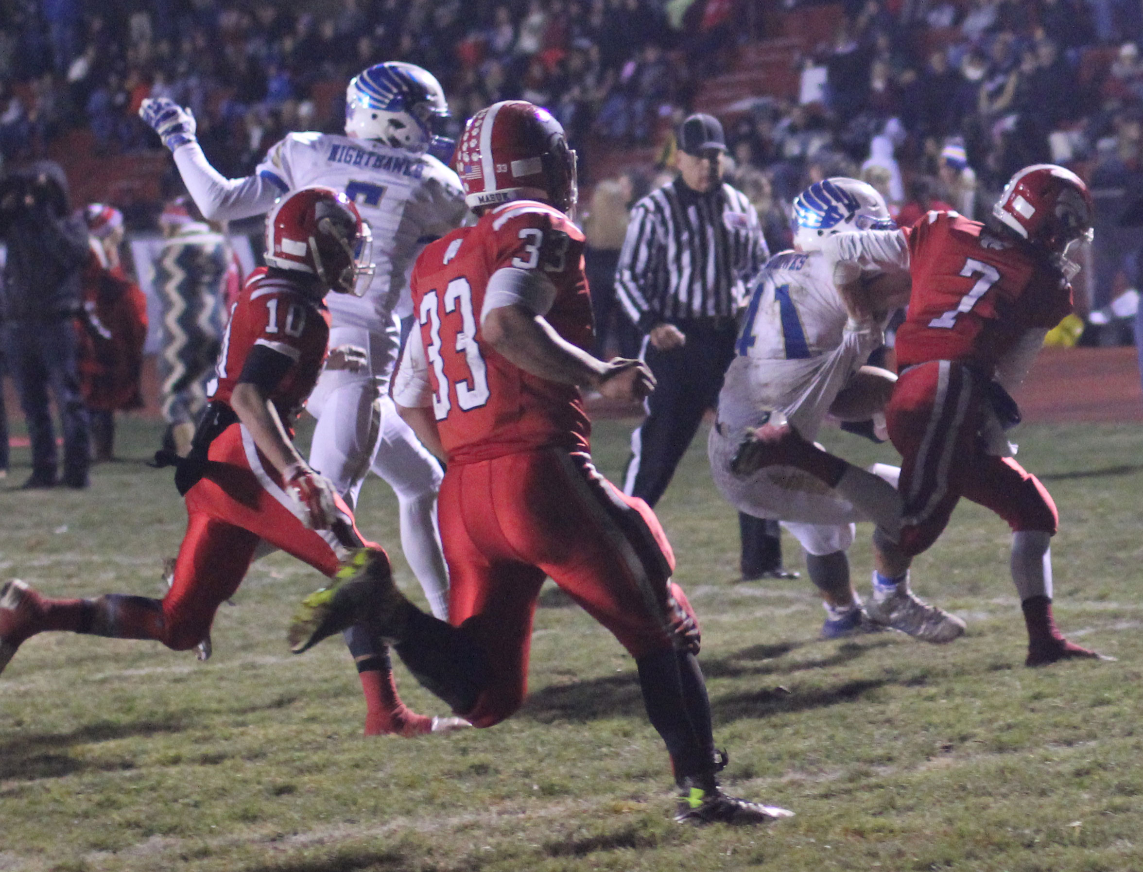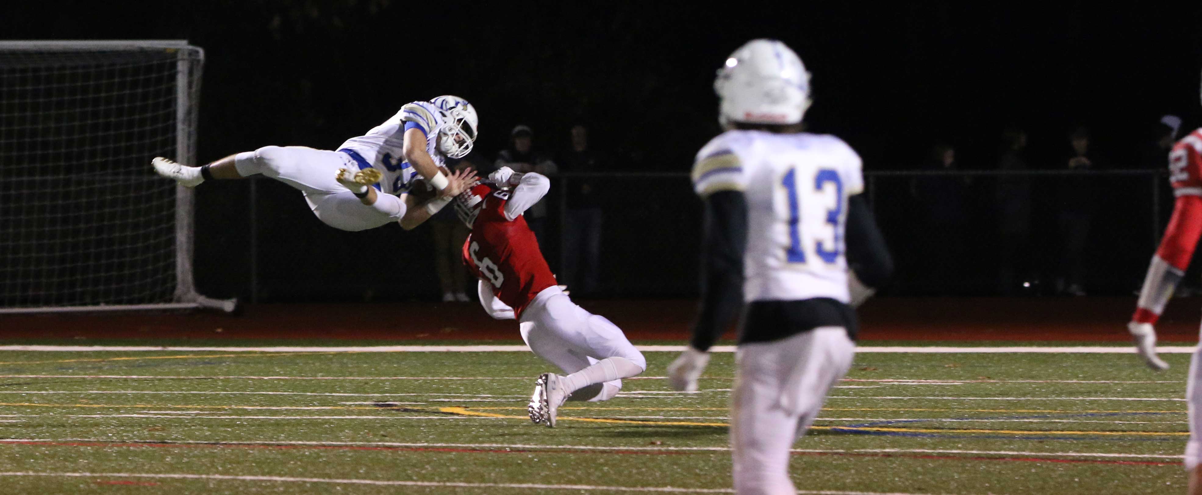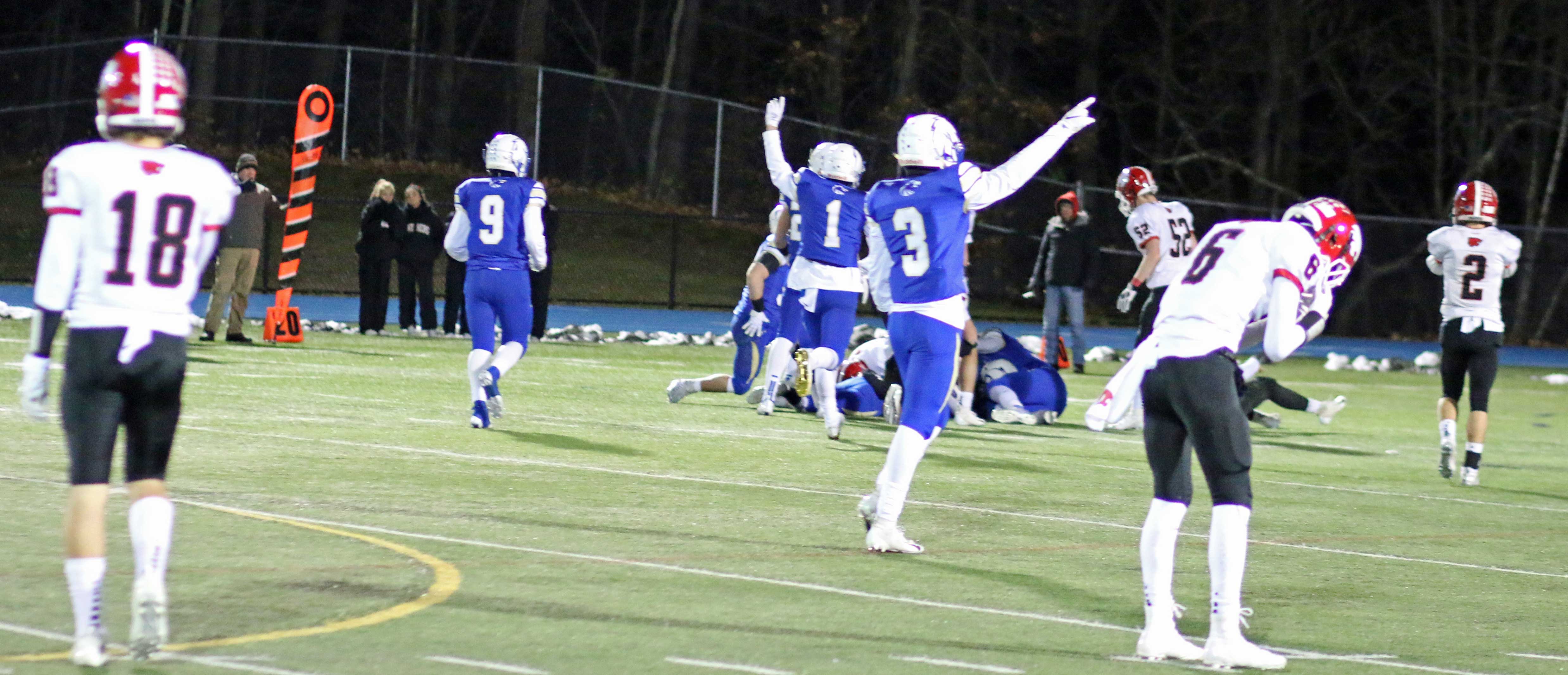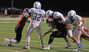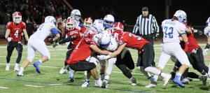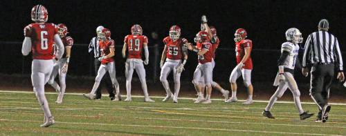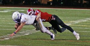 The Hawks caused fumbles (recovered one) and their pressure on quarterback Deric DeAngelis led to two interceptions (Jack Zingaro, Will Swierbut) in the final 1 ½ quarters.