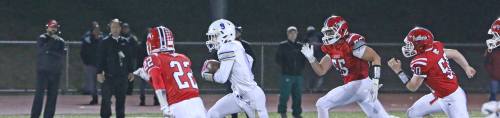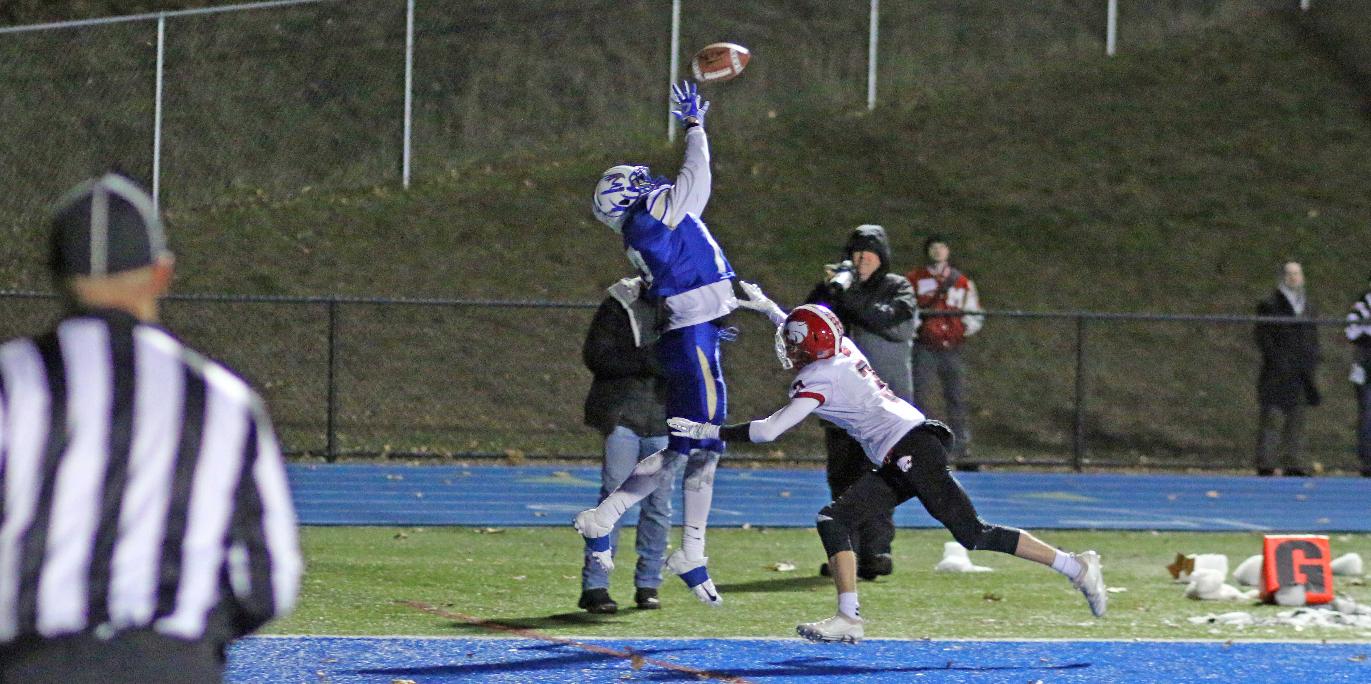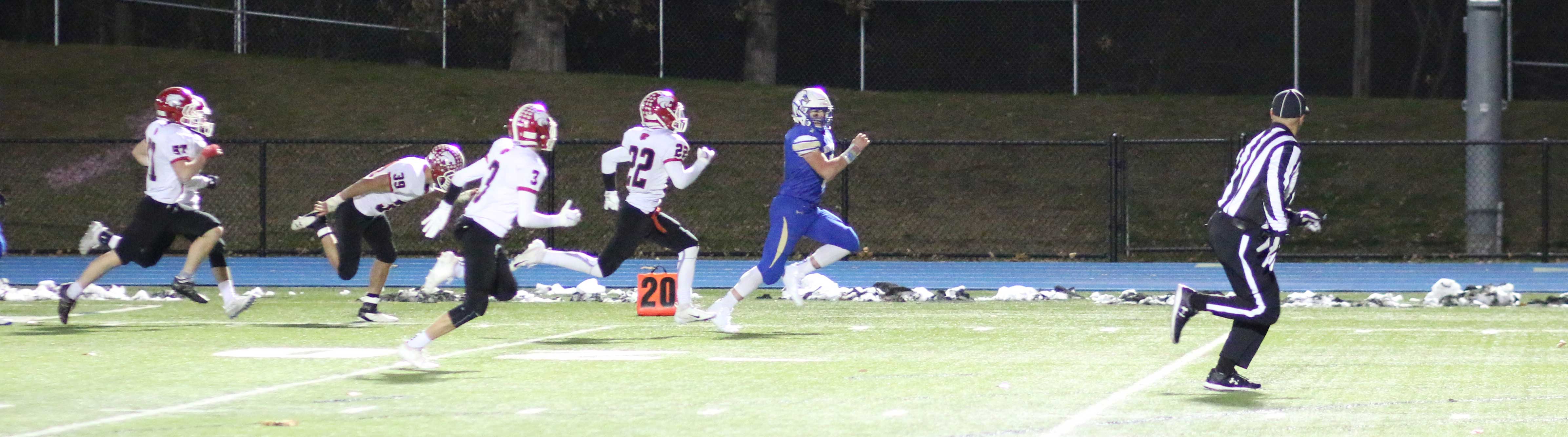 That touchdown-producing sequence impacted the final outcome, according to MHS coach Lato: “It was third-and-eight and we nearly had #6 (Brandon Lombardo) sacked for a big loss but he floated an incompletion. That left them with a makeable 4th down. On the next play he scrambled and hit the kid on a crossing route.”